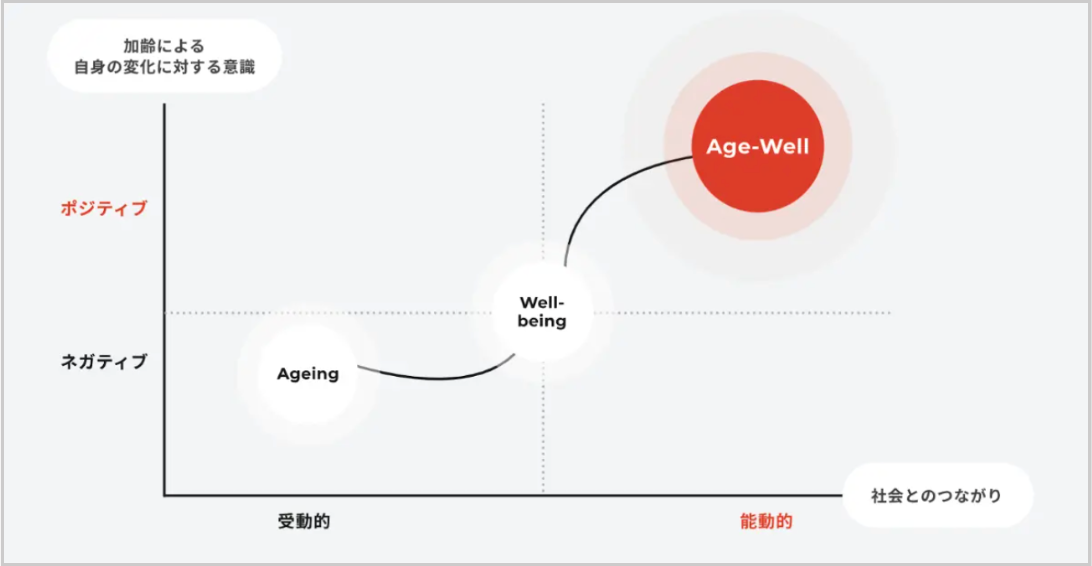 高齢社会において良く使われる言葉として、「肉体的・精神的・社会的すべてにおいて満たされた状態」を指す“Well-Being”があります。これに対して“Age-Well”は、「状態」ではなく「行動」を指します。“Age-Well”とは、歳を重ねることによる自己の変化をポジティブに捉え、社会との能動的な関わりを築いていくことを指します。私たちはそのような「行動」によって人生をワクワクして生きる多くのシニアを知っており、日本にはそのような「行動」を生み出すための事業や社会システムが、さらに必要とされていると考えています。