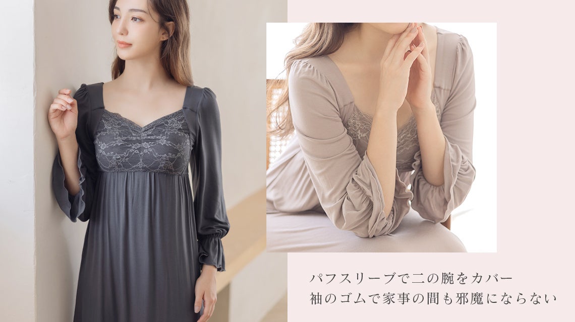 袖のデザインが特徴的な「ラクシアスリープナイトブラワンピース長袖タイプ」