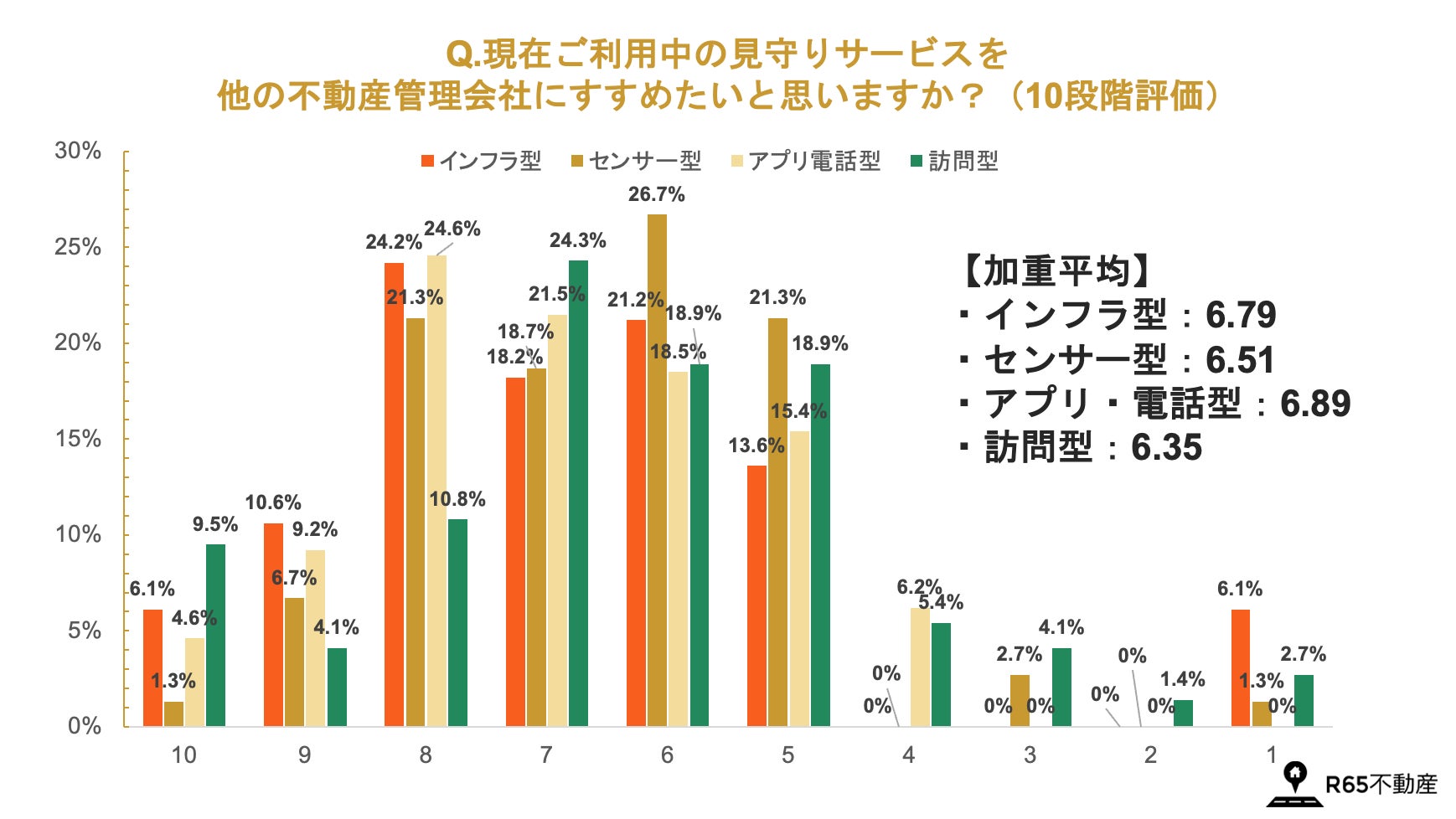 ④見守りサービスの他社へのおすすめ度合いは平均6.55点(10点満点)。「アプリ・電話型(6.89点)」や「インフラ型(6.79点)」が上位となるも大差なし。