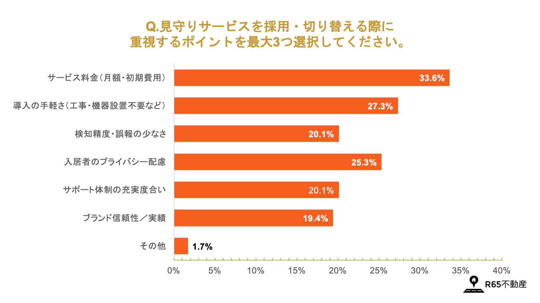 サービス導入・切り替え時に重視するポイントを尋ねたところ、「サービス料金(33.6%)」が最も多く、次いで「導入の手軽さ(27.3%)」、「入居者のプライバシー配慮(25.3%)」が上位に挙がりました。
