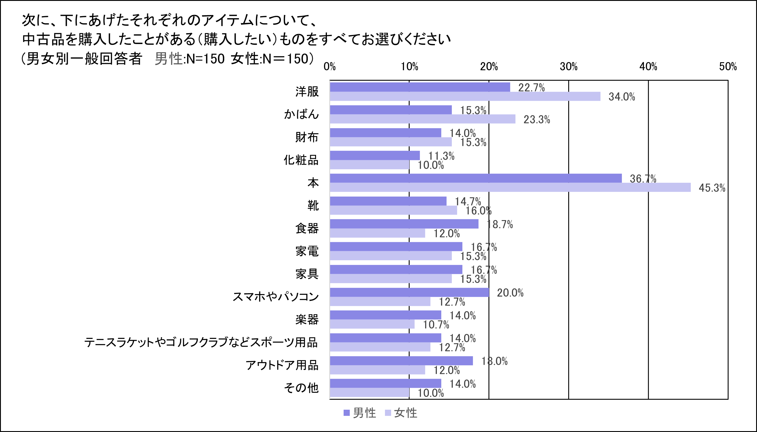 ●中古品で購入したことがある/購入したいアイテムで多かったのは、一般回答者及びペイディユーザーともそれぞれ、本(一般:41.0%/ペイディ:63.5%)と洋服(一般:28.3%/ペイディ:53.2 %)だった。本については、「節約になるから」(一般:52.8%/ペイディ:67.9%)や「一時的に使うだけだから(一般:30.9%/ペイディ:37.7%)」が多く選ばれた。一方、洋服については「節約になるから(一般:47.1%/ペイディ:46.5%)」のほか、「高級ブランド品をよりお手頃価格で購入できた/できるから(一般:28.2%/ペイディ:46.5%)」「デザインや設計などがユニークな製品が手に入るから(一般:28.2%/ペイディ:34.9%)」「正規店で品切れの商品を購入できたから(できるから)(一般:24.7%/ペイディ:46.5%)」などが挙がった。中古品の購入で、個性を出したり、とっておきのアイテムを賢く手にいれる方が多くいることが想像できる。なお、カテゴリー別の購入経験や購入意向について一般回答者の男女で比較すると、洋服(男:22.7%/女:34.0%)、かばん(男:15.3%/女:23.3%)、本(男:36.7%/女:45.3%)は女性の方が高い傾向にある一方、食器(男:18.7%/女:12.0%)、スマホやパソコン(男:20.0%/女:12.7%)、アウトドア用品(男:18.0%/女:12.0%)は男性の方が高い傾向にあった。