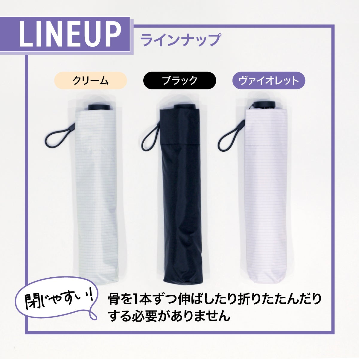 涼しげなヴァイオレットやクリームに、定番のブラックを加えた3色展開です。