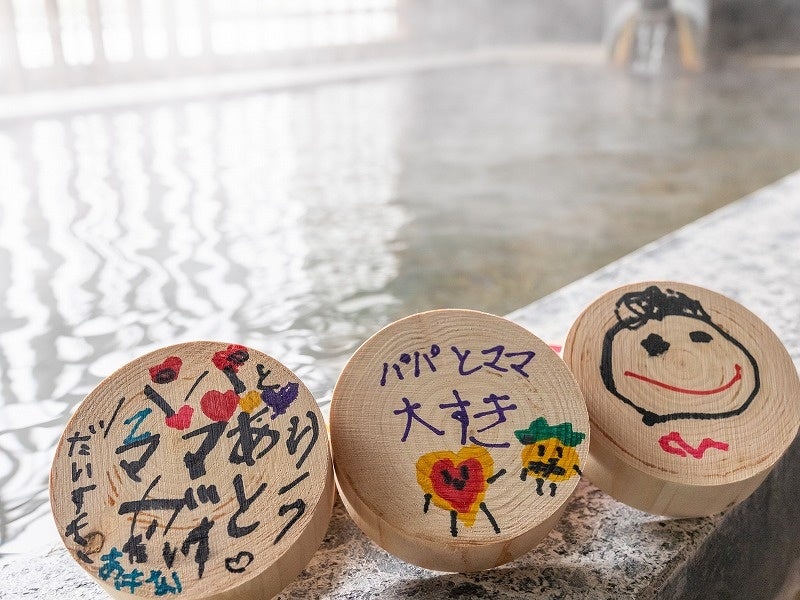 おふろcafé yusaで「父の日100のありがとう風呂」を期間限定開催。地域の子どもたちが入浴木に綴ったお父さんへの感謝の気持ち。メッセージ付きヒノキの入浴木でほっこり癒しのお風呂体験。