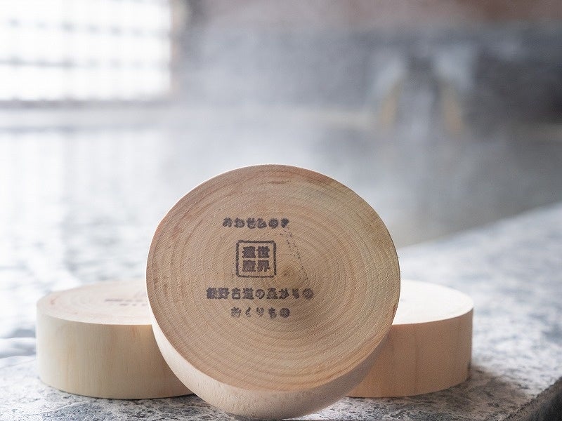 入浴木はサスティナブルの観点からヒノキの間伐材を使用。間伐材の積極的活⽤を通じて地域の里山・森林整備についても意識する機会を提供。
