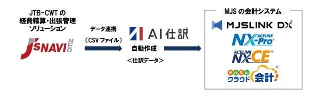 『J’sNAVI NEO』は、出張のオンライン手配システムと経費精算システムが一体化した経費精算・出張管理ソリューションで、シリーズ累計で約600社の導入実績があり、85万人超のユーザーが利用しています。今回のデータ連携により、『J’sNAVI NEO』から出力した交通費や交際費、出張精算等に関するCSVファイルをMJSの会計システムに取り込むことで、「AI仕訳」による過去の仕訳データとの照合により、会計上の仕訳の自動生成が可能となります。これにより、会計・経理部門等に従事するユーザーは会計システムにデータを転記する作業や勘定科目を選択する手間が無くなり、会計業務の効率化を実現します。