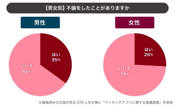 既婚者を対象に不倫経験についてアンケートをとったところ、既婚男性の35%が不倫経験ありと回答しました。また、既婚女性の不倫経験者が26%となっており、男性の方が女性に比べて不倫経験が多い傾向にあります。