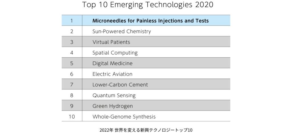この社会課題を解決し、安心・安全な医療ケアを実現するのが、注射に代わる新技術「マイクロニードル」です。長さ数百ミクロンの微細な針で、皮膚から薬剤や有効成分を吸収させる技術「マイクロニードル」は、2020年の世界経済フォーラムで「世界を変える新興テクノロジートップ10」※1に選出。使用にあたって高価な機器や高度なトレーニングを必要としないため、医療サービスが行き届いていない地域での検査や治療に役立ち「医療がより身近なものとなる技術」と紹介され、注目と期待を集めています。