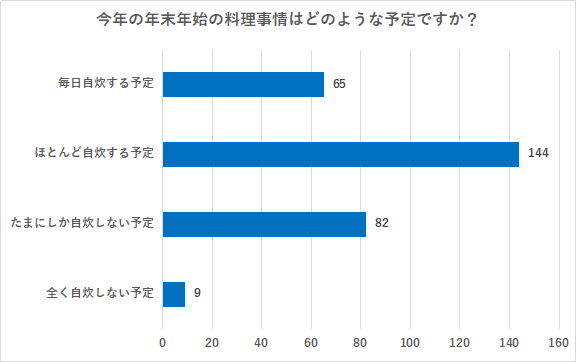 今回、橋本商会では、年末年始の料理事情についてのアンケート調査を行いましたが、年末年始は基本的に自炊で済ます予定の方が多い傾向でした。