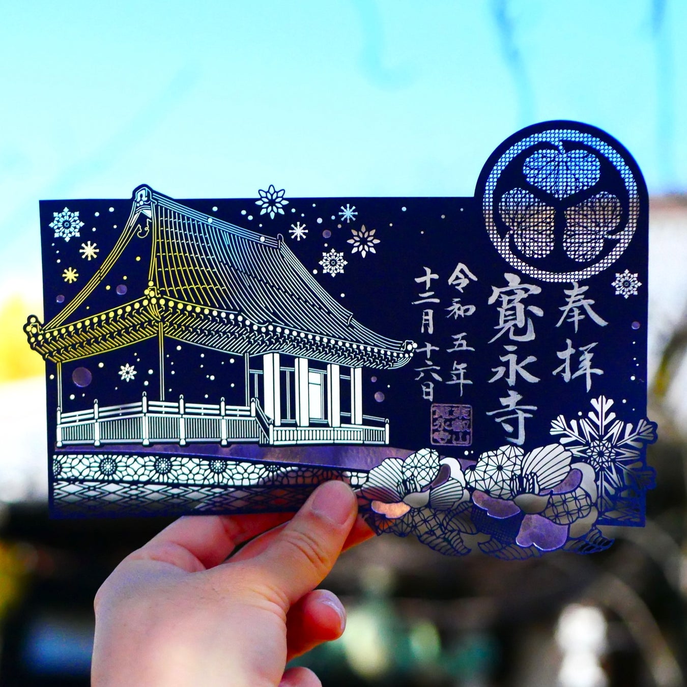 寛永寺の本堂である「根本中堂」と徳川家の象徴でもある「葵の御紋」を細やかな切り絵で表現いたしました。また、紺色の台紙には品のある薄紫の箔押しを施し、冬景色を演出しています。雪降る冬に美しく佇む根本中堂の姿を、この1枚の切り絵御朱印を通して感じていただけたら幸いです。