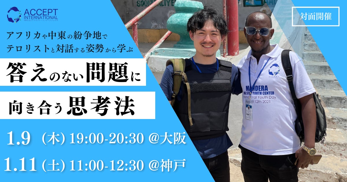 海外で紛争解決に取り組むNPO法人アクセプト・インターナショナル(東京都中央区、代表理事:永井陽右)は、大阪市中央区(南本町)と神戸市中央区(加納町)にてトークイベントを行います。同法人がアフリカや中東の紛争地での活動を通じて培ってきた問題解決の思考法・ノウハウに加え、ビジネスの現場にも活かせるようなマインドセットについて、実際に海外の現場でも活動してきたスタッフがお伝えします。