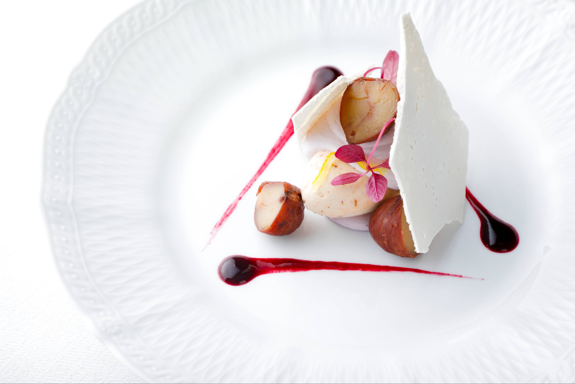 締めくくりは優しい甘みのマロングラッセと、甘酸っぱいカシスのソースが織りなす秋の季節を表現した繊細なデザートです。フロマージュブランと京都城陽産のみずみずしい無花果で作るアイスクリームに、水尾の柚子の皮をあしらい、全体の甘さを控えめにして、爽やかな秋の風味をお楽しみいただけるよう仕上げました。