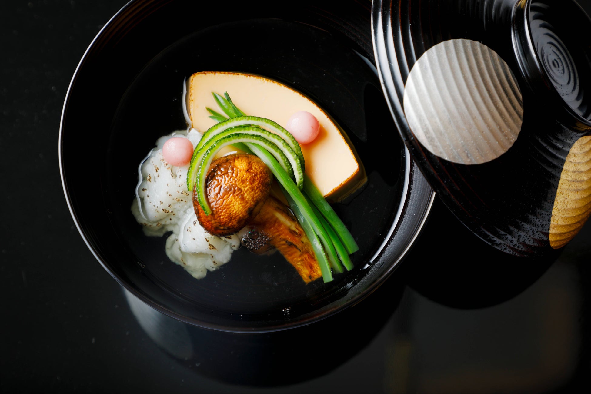二品目の椀盛は季節の移ろいを表現し、最も相性の良い秋の食材と言われる名残の鱧と走りの松茸に、豆名月に因んだ三度豆をあしらいました。玉子豆腐はこれから月が満ちていく事で縁起が良いとされる十三夜の月に見立てています。