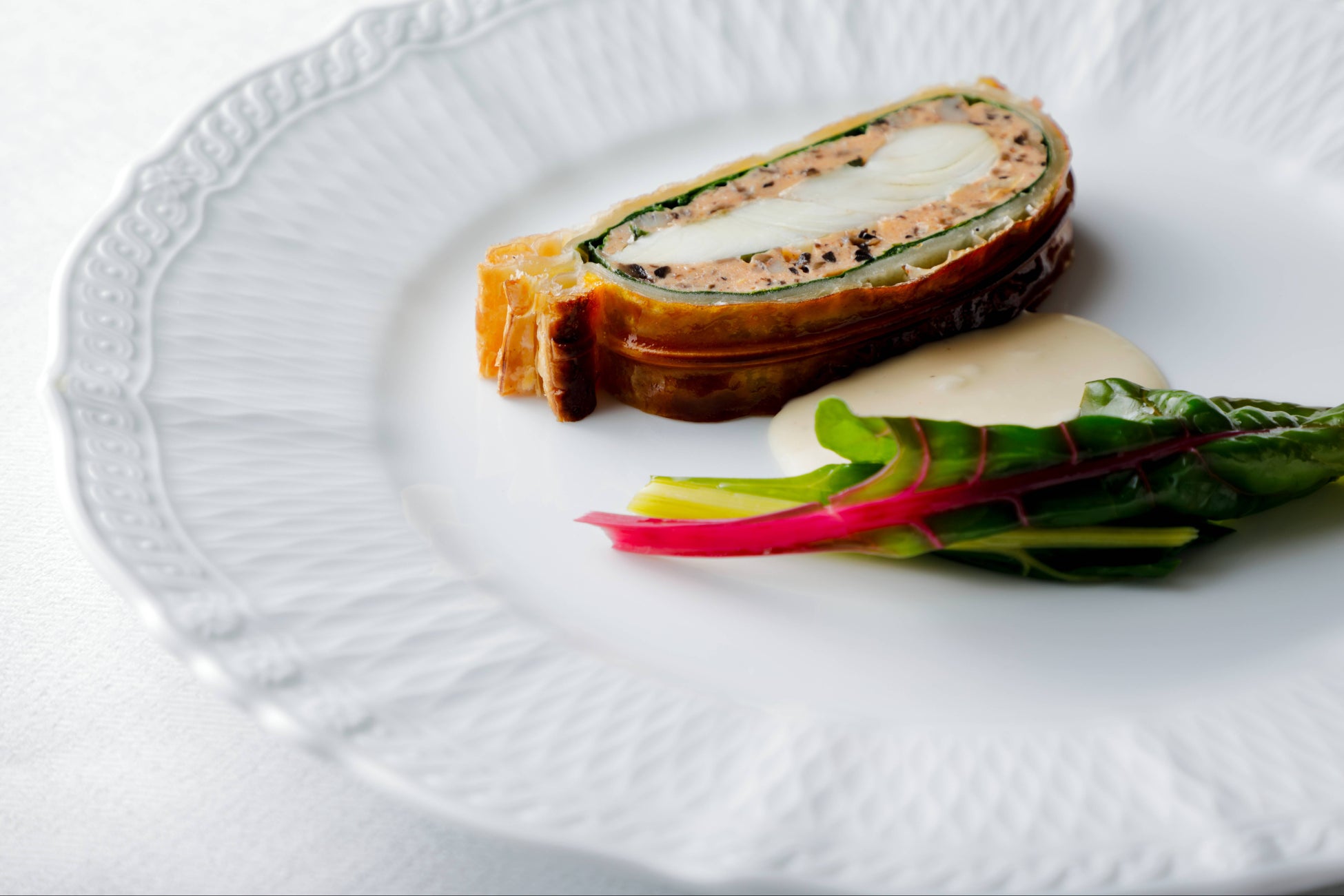 三品目、的鯛のウェリントンはコクと旨味が強いとされる的鯛と車海老で作る濃厚なムース、マッシュルームペーストをほうれん草とパイ生地で包み込み焼き上げました。パイ生地のサクサクとした歯ごたえと、しっとりと焼きあがった的鯛、ムースの優しい口溶けの良さを同時にご堪能いただけます。淡泊な味わいのお魚とマッシュルームの濃厚な味わいにあわせた白ワインベースのさっぱりとしたソースでお召し上がり下さい。