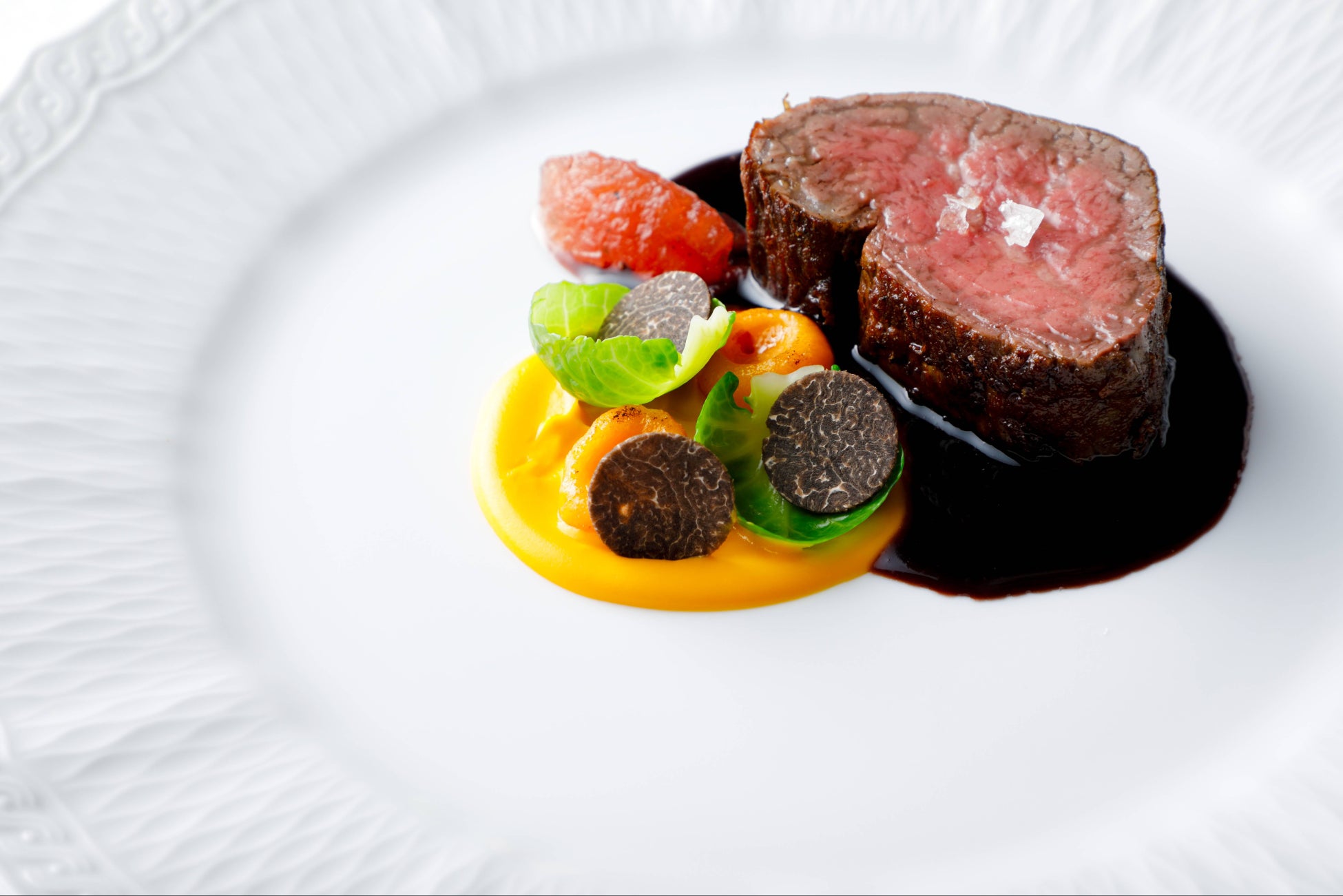 コースのメインは近江牛の柔らかなテンダーロインをしっとりとジューシーに焼き上げ、付け合わせには、秋の食材南瓜とパルメザンチーズを使ったニョッキに香り高い黒トリュフをあしらいます。赤ワインビネガーを効かせた甘酸っぱい紅玉林檎のチャツネが、近江牛の味わいをより一層引き立てます。