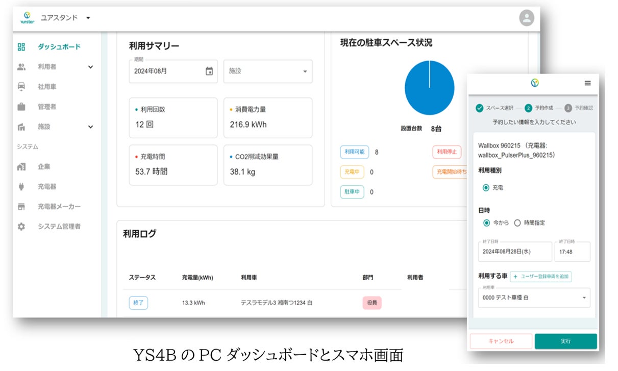 充電管理にはユアスタンド開発のYourstand for Business(以下、YS4B)を採用し、充電時間・充電状態監視・CO2削減量等を一括管理、顧客にとって利便性の高いオペレーションを実現します。また、YS4Bの充電スケジュール管理機能を使用することで、電力価格が安い時間帯に充電時間をシフトし安価な電気代での充電を実現します。