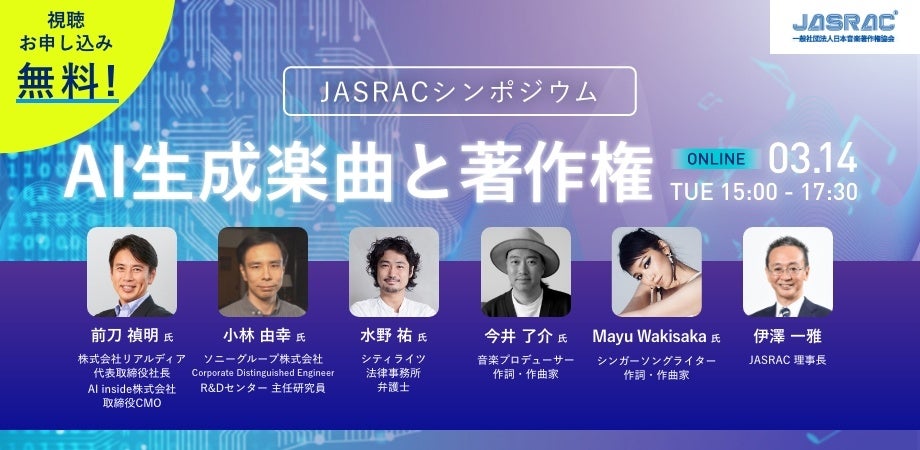 日本音楽著作権協会(JASRAC)は、3月14日(火)15時から、「AI生成楽曲と著作権」をテーマとしてJASRACシンポジウムを開催(オンライン配信)いたします。AIや音楽に関わる方、ご興味をお持ちの方にとって有益な内容となるよう企画しましたので、ぜひ参加ください。