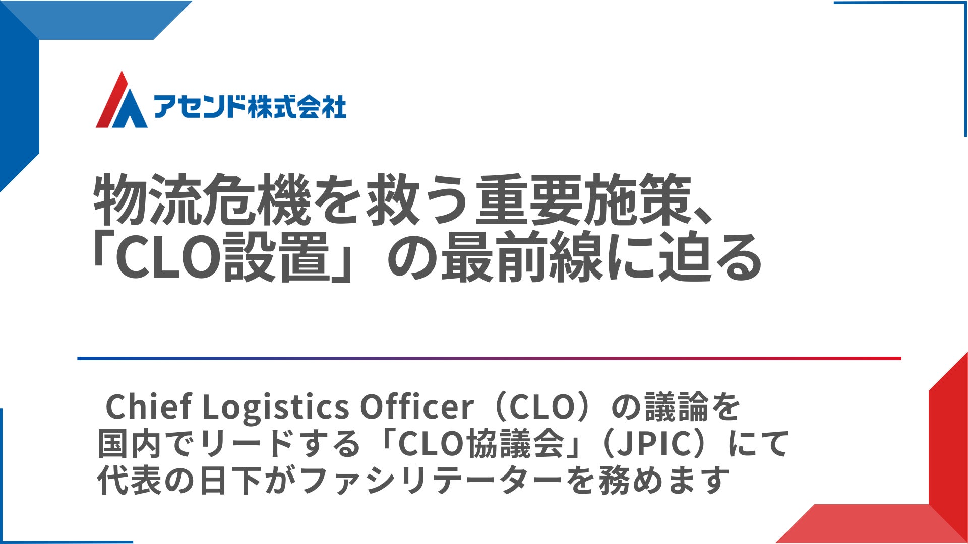 物流DXを推進するアセンド株式会社(本社:東京都新宿区、代表取締役:日下瑞貴、以下「当社」)は、一般社団法人フィジカルインターネットセンター(以下「JPIC」)が主催する第二回CLO協議会にて、「CLO」の未来像に関するディスカッションのファシリテーターを弊社代表の日下が務めることとなりましたのでお知らせいたします。当ディスカッションは、強靭で持続可能な「物流」の実現に向けて、「CLO」に求められるミッションや職能について、国土交通省や経済産業省を初めとした中央省庁と、荷主企業・物流関連企業が意見交換をする場となっております。