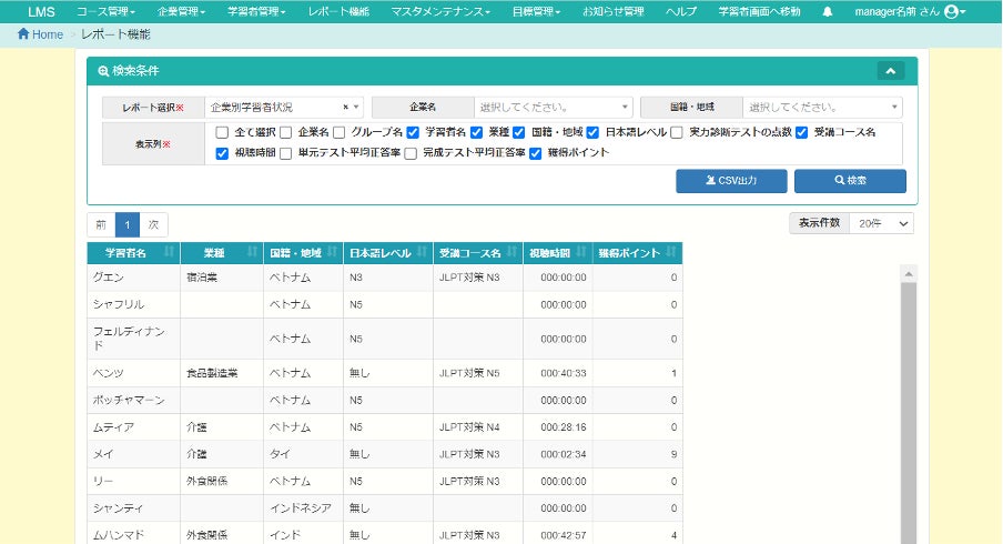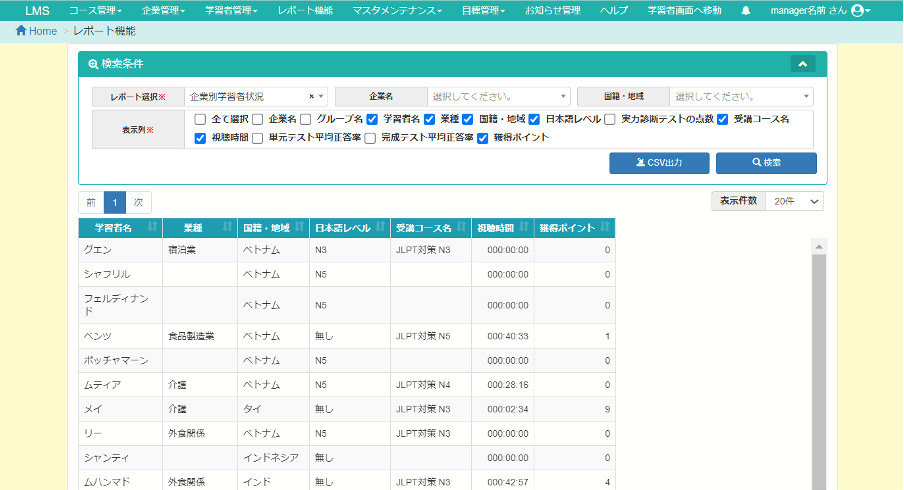 学習者が自分で目標を設定し、その目標に向かって自分の学習の経過と成果をシステム内で確認することが可能です。管理者は、経過と成果を確認できることで、学習モチベーションを向上・維持することにつながります。