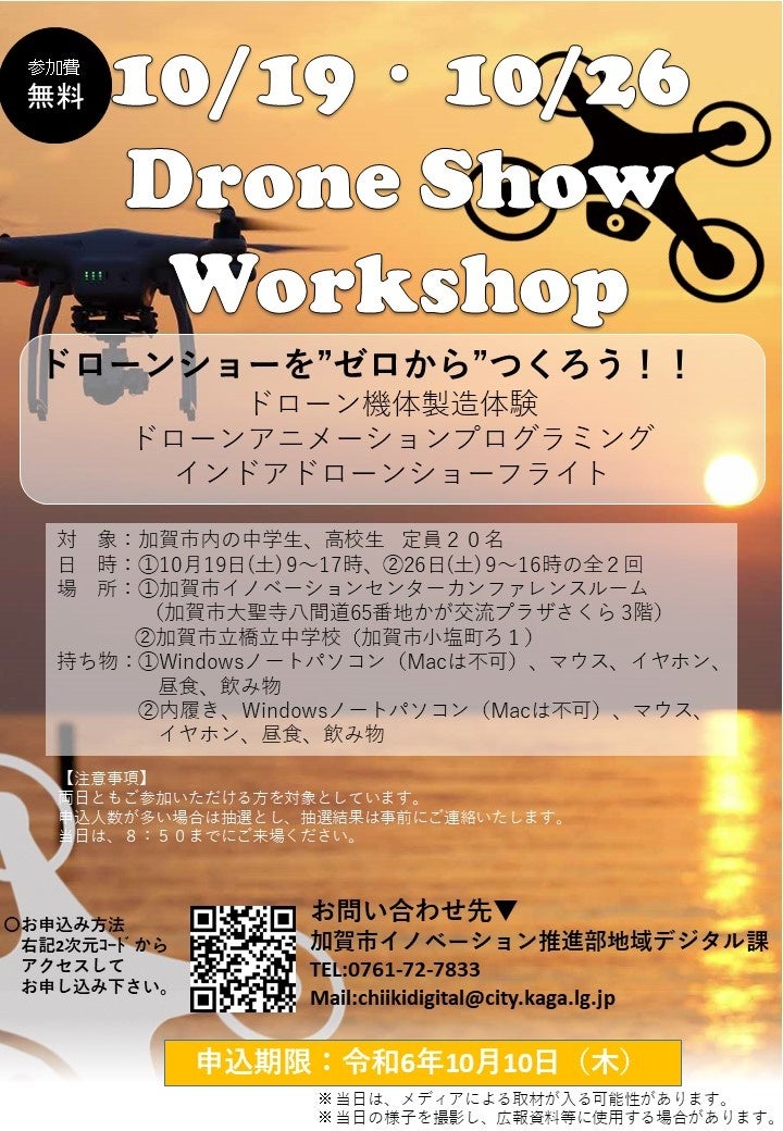 石川県加賀市にて、国内実績最多※を誇るドローンショー企業である株式会社ドローンショー・ジャパンによるワークショップが開催され、市内の中学生・高校生が制作したドローンショーフライトの発表を行います。
