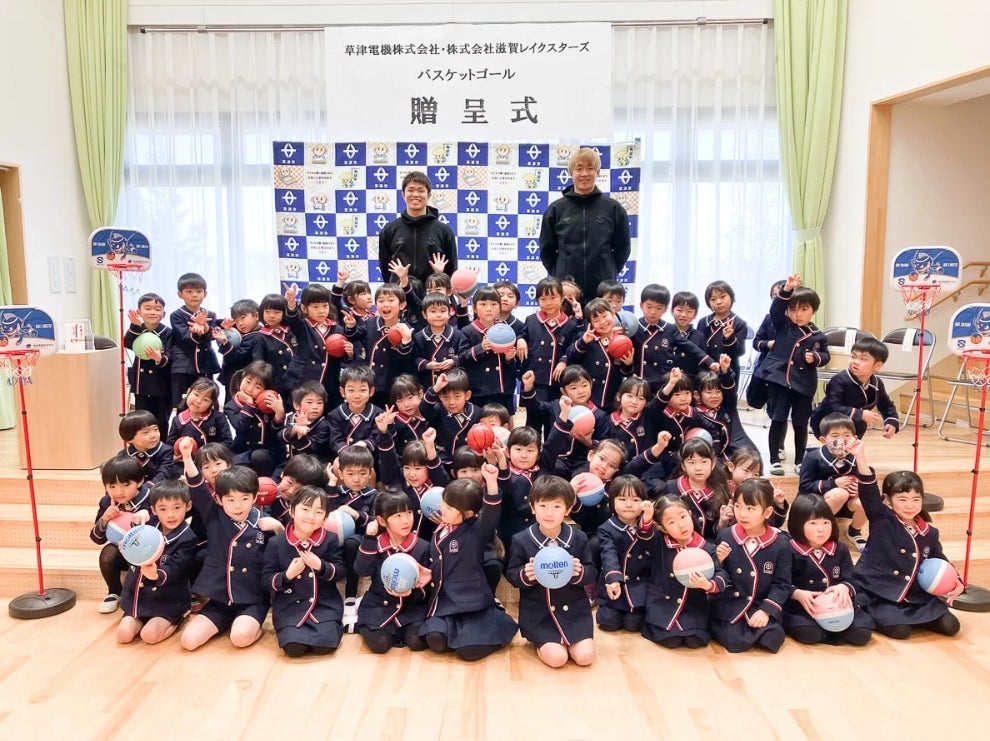 2月27日には寄贈先の一つである草津市の光泉カトリック幼稚園を、草津市の山本芳一副市長、草津電機の北村嘉英代表取締役会長、髙田豊郎代表取締役社長、小西哲也常務取締役、滋賀レイクスの釜渕俊彦代表取締役社長、選手を代表して柏倉哲平選手、森山修斗選手が訪れて寄贈式を行いました。