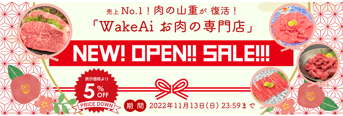 WakeAiが「お肉の専門店」を開設、オープニングセールとして「店舗内商品全品5%OFF」を開催