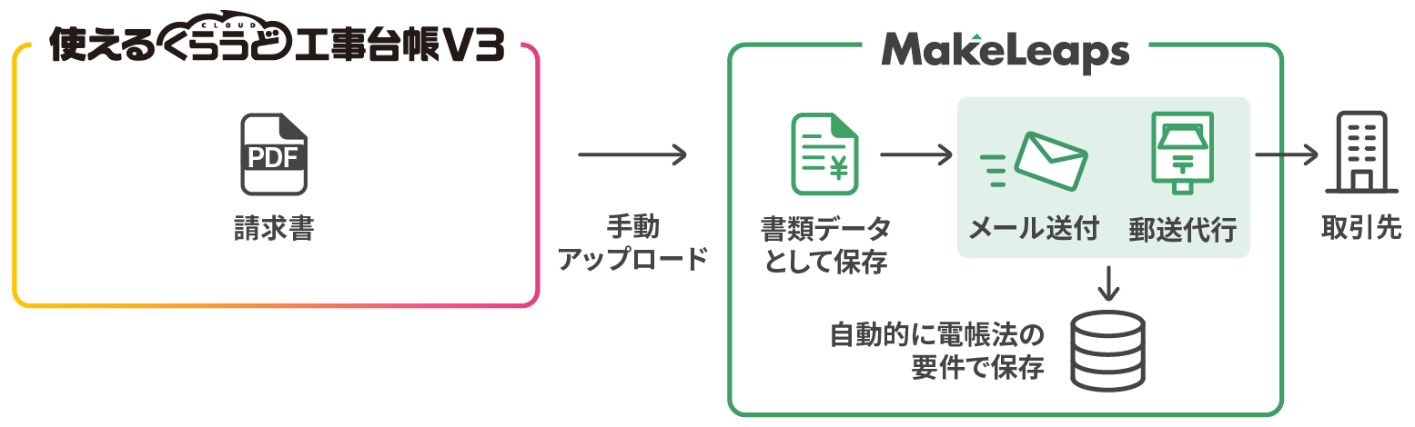 今回のサービス連携を利用することにより、「使えるくらうど工事台帳」より出力した請求書データをワンクリックで「MakeLeaps」に連携します。連携したデータは書類情報として登録されるため、書類作成後の郵送・電子送付や入金業務が「MakeLeaps」で一元管理できます。