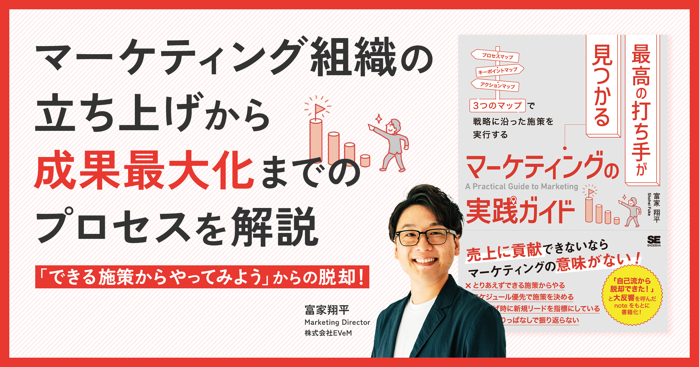 本書は、著者のnote記事「5年間やってわかった、BtoBマーケターがやるべき仕事の全体感」をもとに書籍化した1冊です。記事の公開後に「自己流から脱却できた」と多くの反響をいただいたことから、マーケティングに関わる全ての人が、今日やるべきことに自信を持って取り組める ようになってほしいという思いを込めて書籍化に至りました。