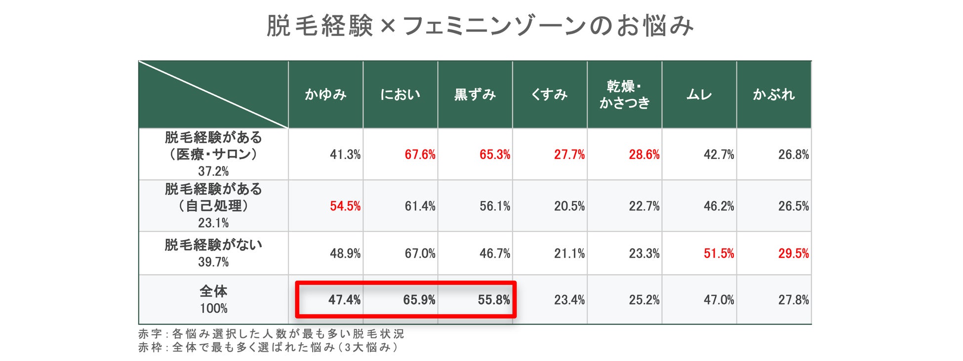脱毛経験者(医療・サロン)は「黒ずみ」や「くすみ」の悩みを抱えることが多く、フェムケア使用経験が比較的多い傾向にありました。一方、自己処理での脱毛を行っている人は「かゆみ」や「乾燥・かさつき」、脱毛未経験者は「ムレ」や「かぶれ」の悩みが多いことが分かりました。