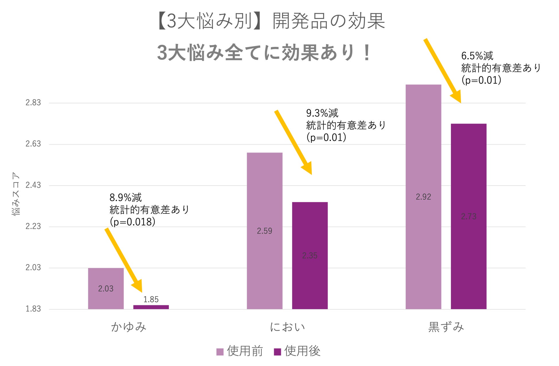3大悩み(かゆみ、におい、黒ずみ)は月経期(生理中)に最も強く表れ、黄体期(排卵後から月経開始まで)に最も軽減される傾向にあることが明らかになりました。また、開発製品の使用前後で、3大悩み「全て」の有意な軽減効果を確認できました。さらに、Floraの生理周期に関連したアンケートシステムを活用することで、悩みの改善が生理周期の影響ではなく、開発製品による効果であることも立証されました。