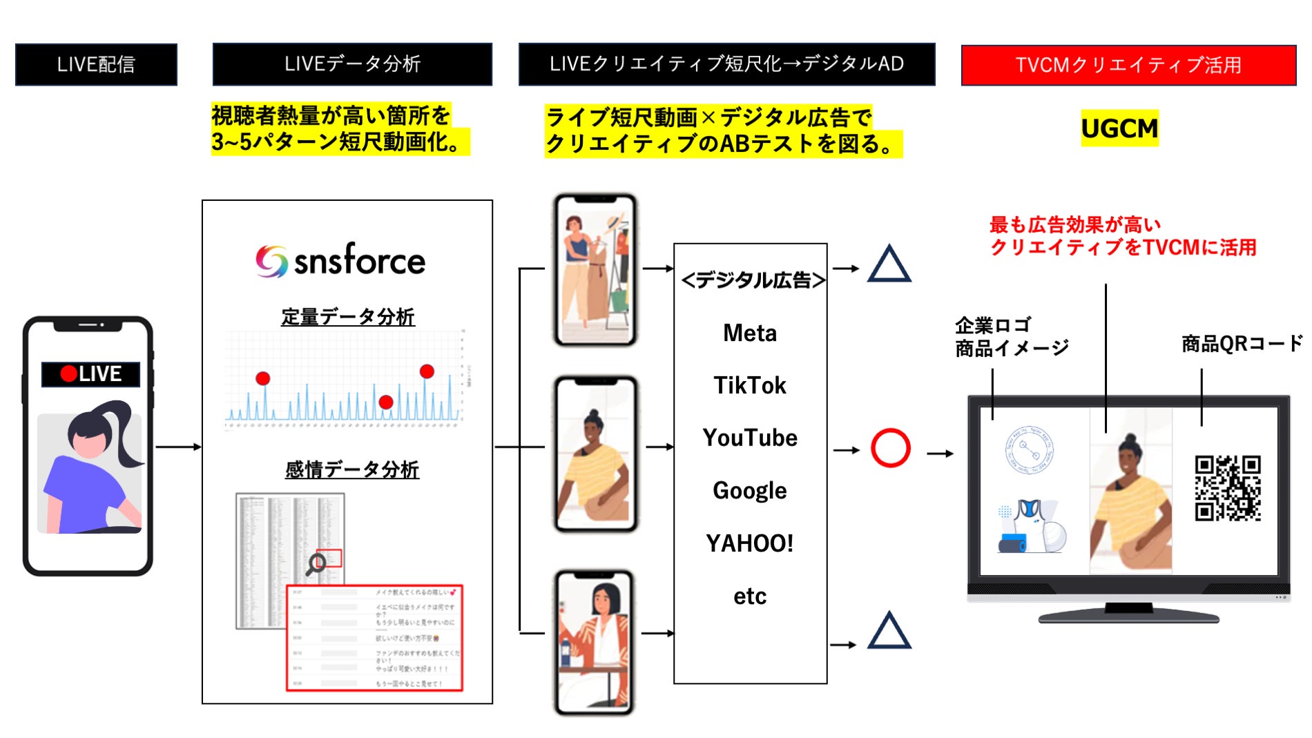 一方、CMIは広告宣伝費の中でも最も大きな支出と言われるTVCMを、誰でもわかりやすく効率的に出稿できる日本初のインハウス型TVCMツール「CM in-house」(以下、CMインハウス)を展開しています。両社の強みをワンパッケージにすることで、ライブ動画から最も熱量の高い=最も売れる瞬間を抽出し、UGC(User Generated Contents;ユーザー同士が共感し拡散するコンテンツ)に近いクリエイティブとしてデジタル広告運用からTVCMの出稿までを行います。