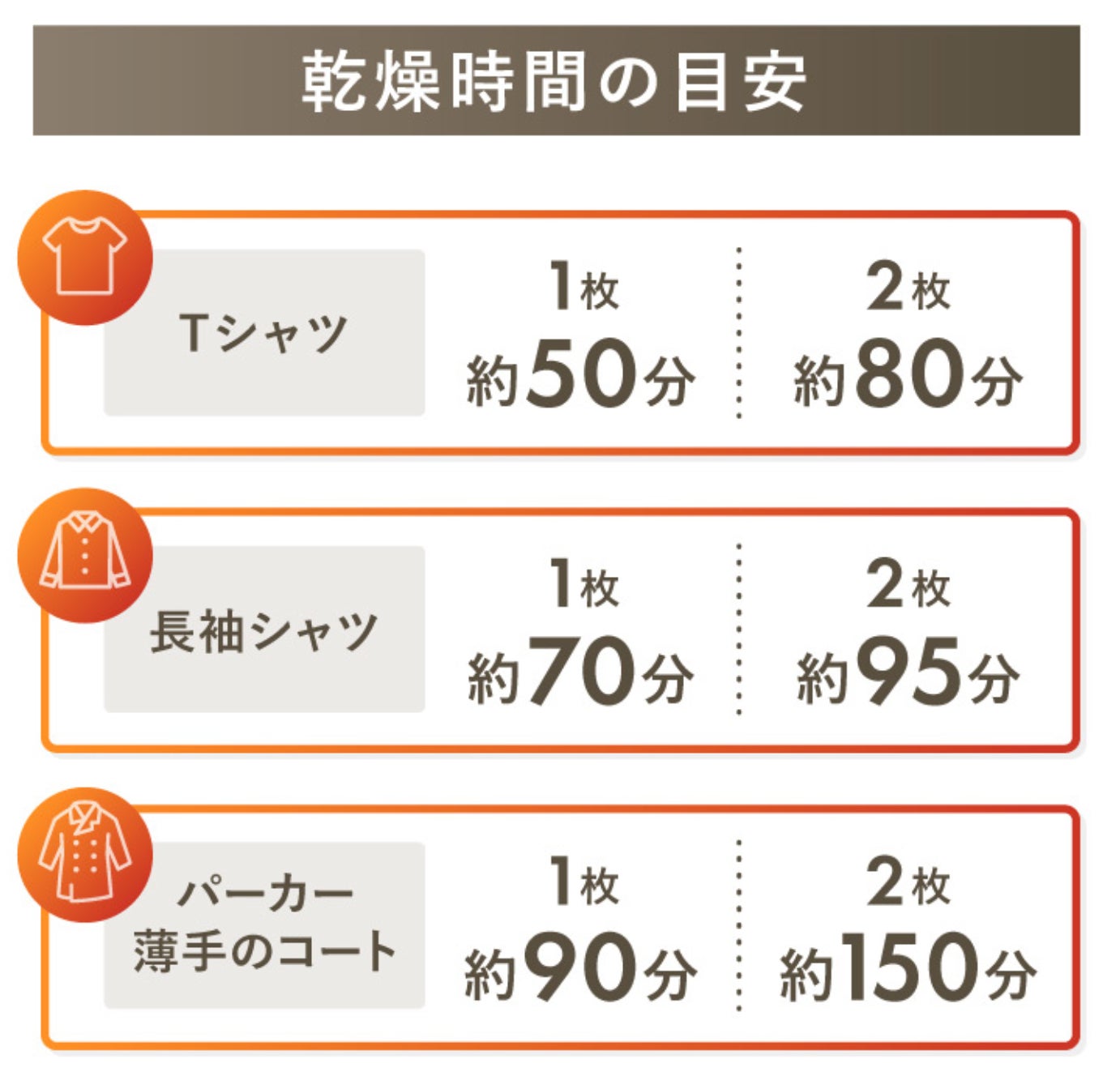 乾燥時間はTシャツ1枚約50分、パーカー、薄手のコートは1枚約90分とスキマ時間で場所を取らずに、効率的に衣類をしっかりと乾かすことができるので、日常生活での手間や負担が大幅に軽減されます。