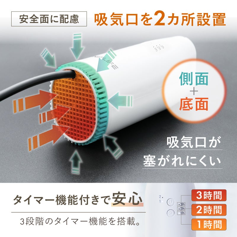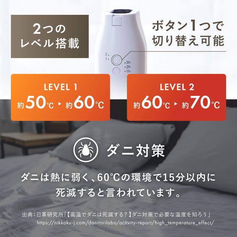 さらに、ボタン1つで切り替え可能な2つの温度レベル、3段階のタイマー機能を搭載し様々な環境下でご使用いただけます。