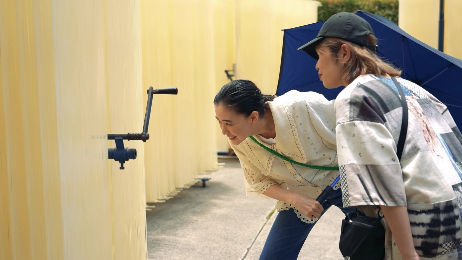 素麺工場での撮影では、辺り一面に干された素麺を見て、「わー!すごい!初めて見た!圧巻ですね!」と目を輝かせ、笑顔で溢れました。撮影前に素麵工場の方から、なぜ干しているのかなど素麵について説明を受けると「はぁー、なるほどー。」と興味津々。撮影も、干した素麺を移動させながら歩く工場員さんと、自転車を押しながら歩く蒼井さんのタイミングを合わせるのが難しい撮影でしたが、1回目から監督の「OK」が出て、普段から訪れているかのような自然体なシーンが完成しました。
