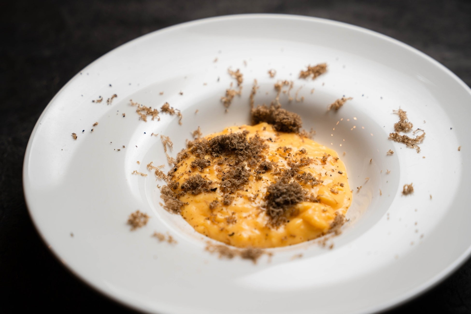 濃厚なウフブルイエの上に繊細な香りのオータムトリュフを