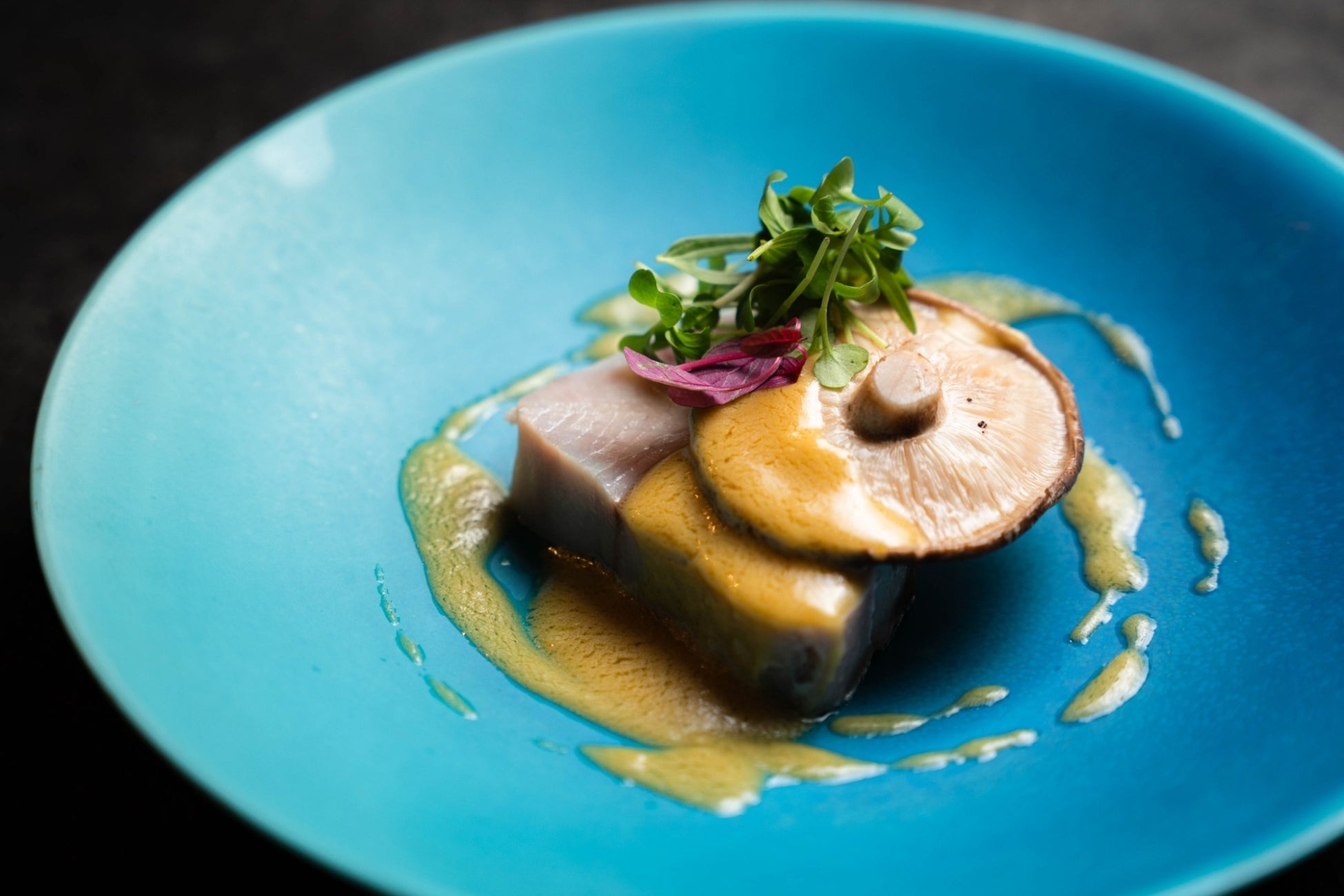 口溶けがなめらかになるように調理。蒸し焼きにした肉厚な「八色しいたけ」を添えました。