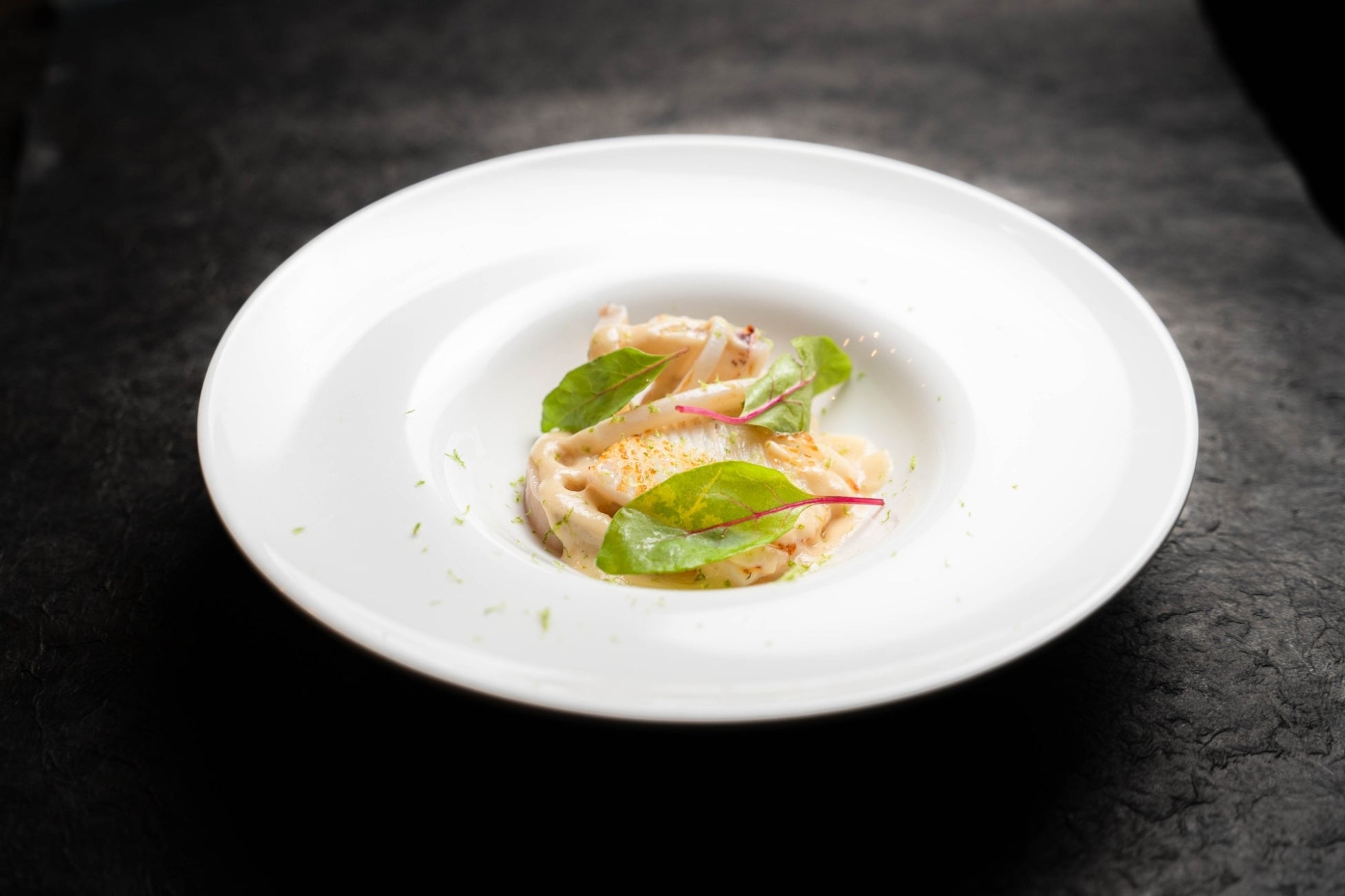 ⑤アオリイカの軽いソテーとエシャロットクリームソース、ライムのアクセント