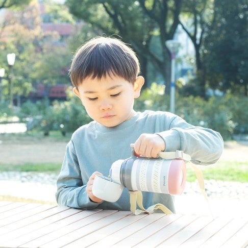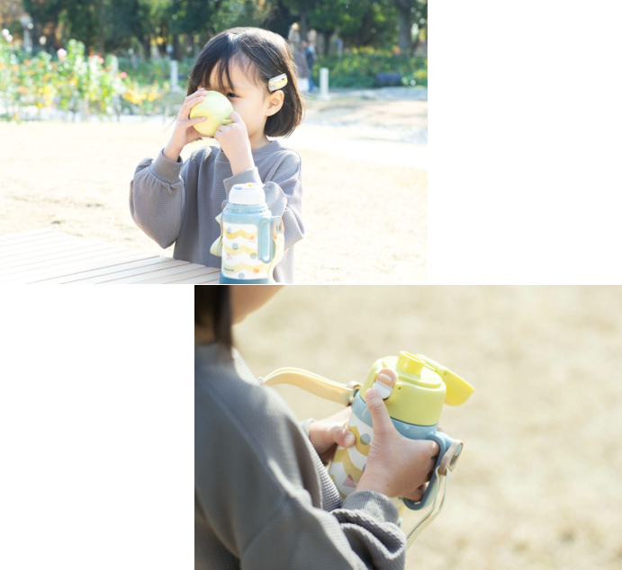 今回発売する『2WAYタイプ(コップ&直飲み)ボトル』は、今まで幼児向けの商品にありがちだったキャラクターものや幼児向けのデザインを排し、親御様がお子様に持たせたいと感じるようなデザインを採用しています。また、人気の高い従来のコップを残しつつ、お客様から要望が多かった直飲み栓を追加しました。取っ手がついているため、小さい子供でも扱いやすい構造となっています。
