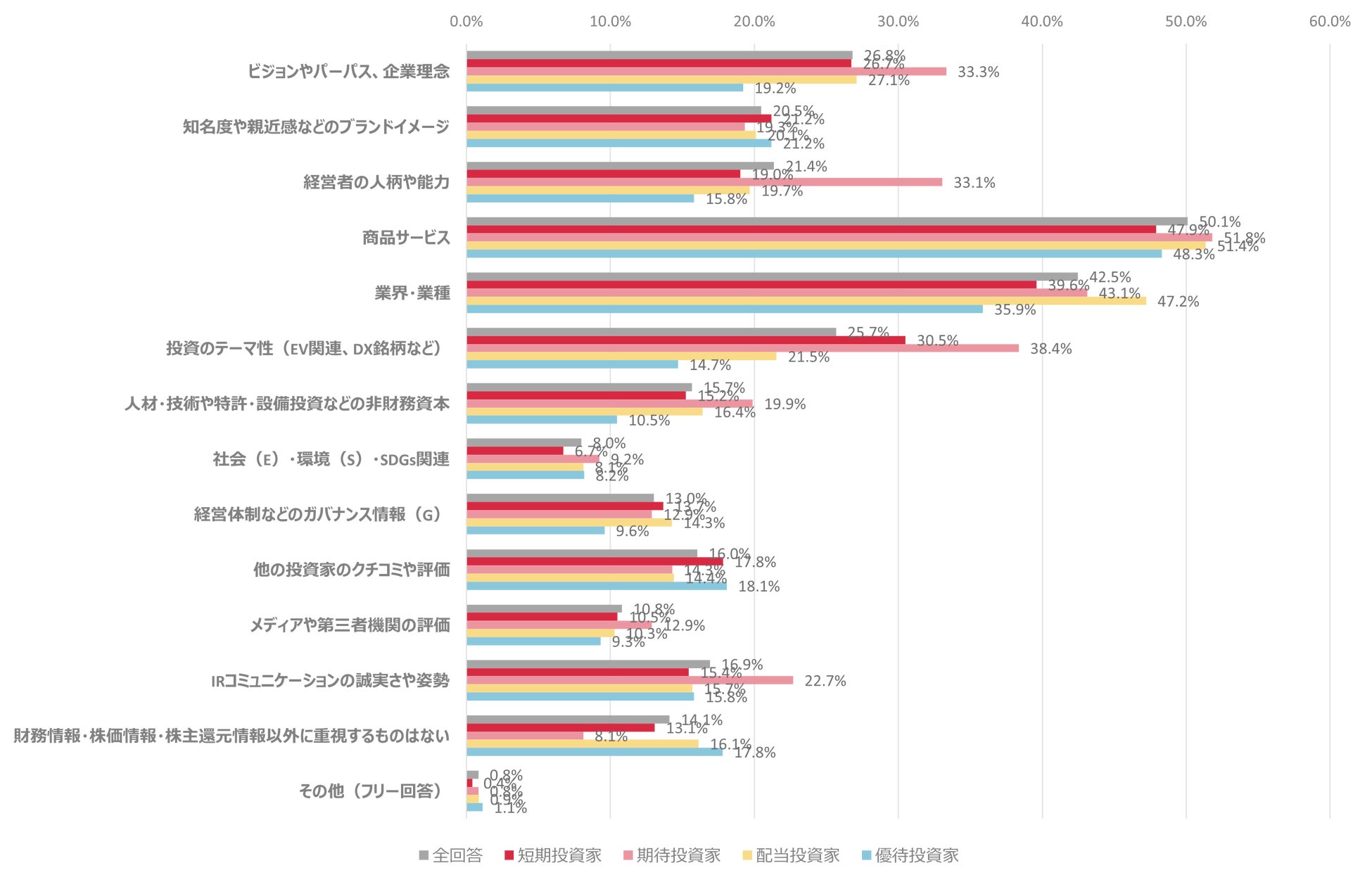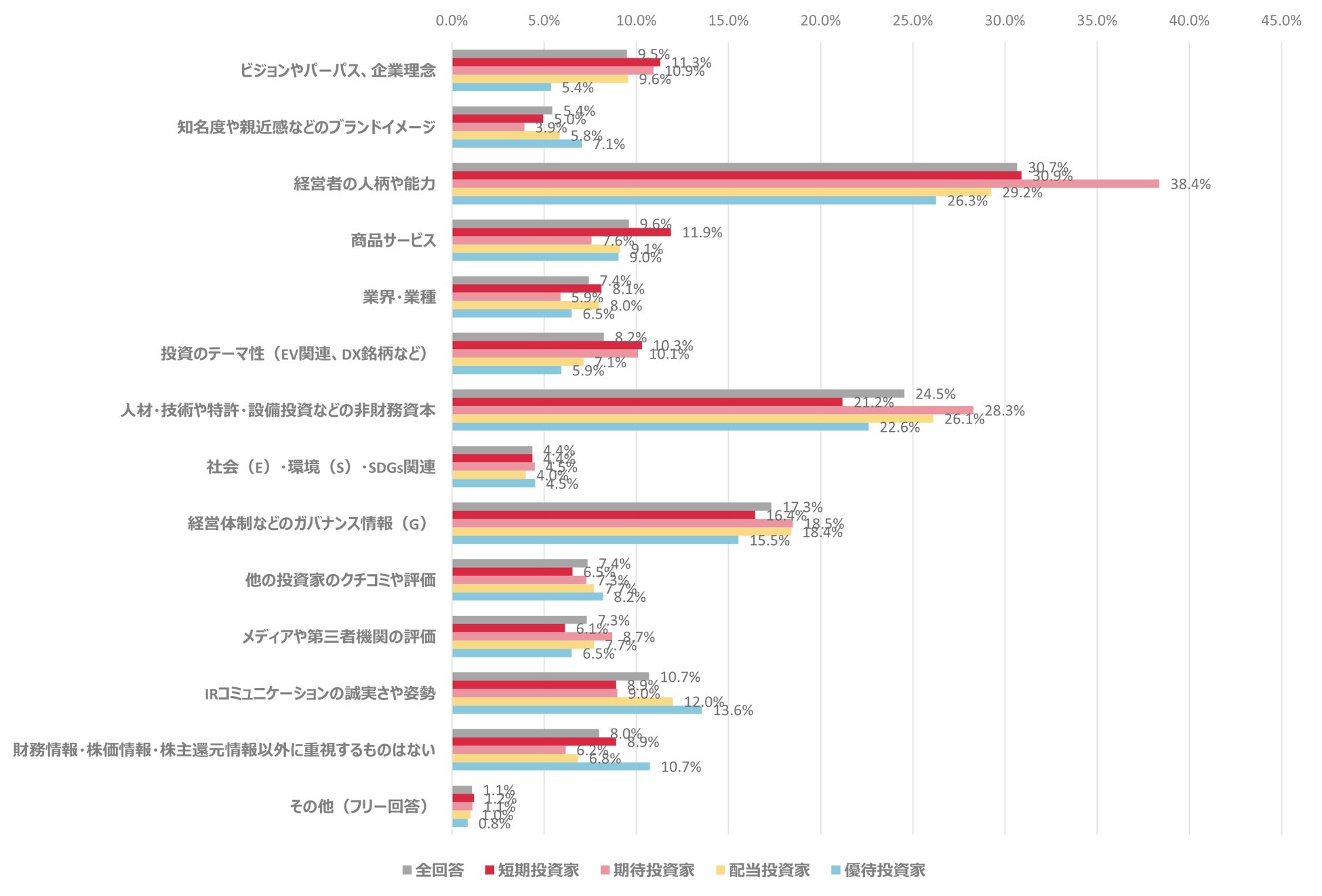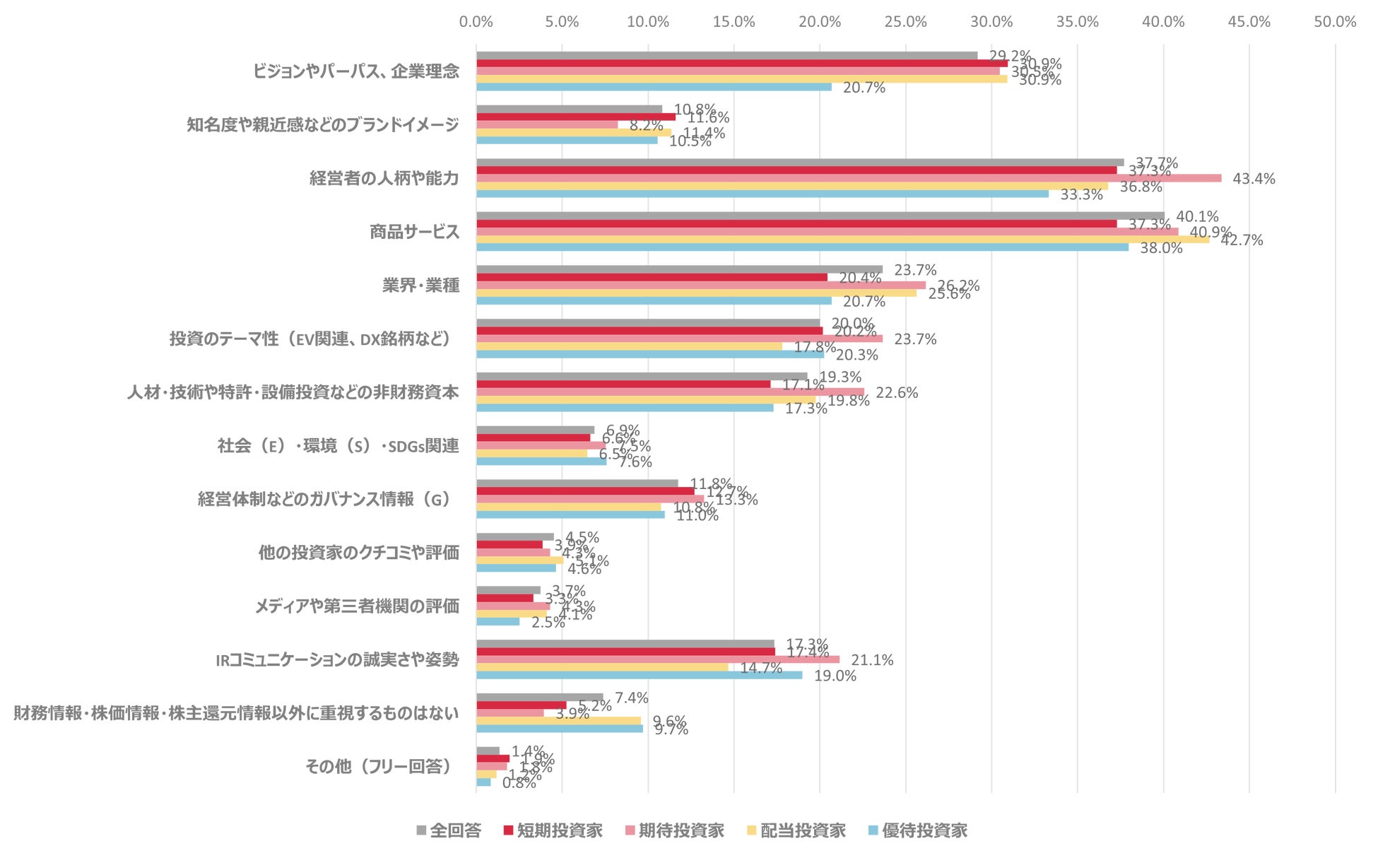 一方、期待投資家は、、投資のテーマ性(38.4%)ビジョンやパーパス(33.3%)、経営者の人柄(33.1%)、IRの誠実さ(22.7%)などの項目において他より高い傾向にあり、長期的な企業成長において、特に経営やIRの姿および企業の目指す姿などの要素を重視していることがわかった。