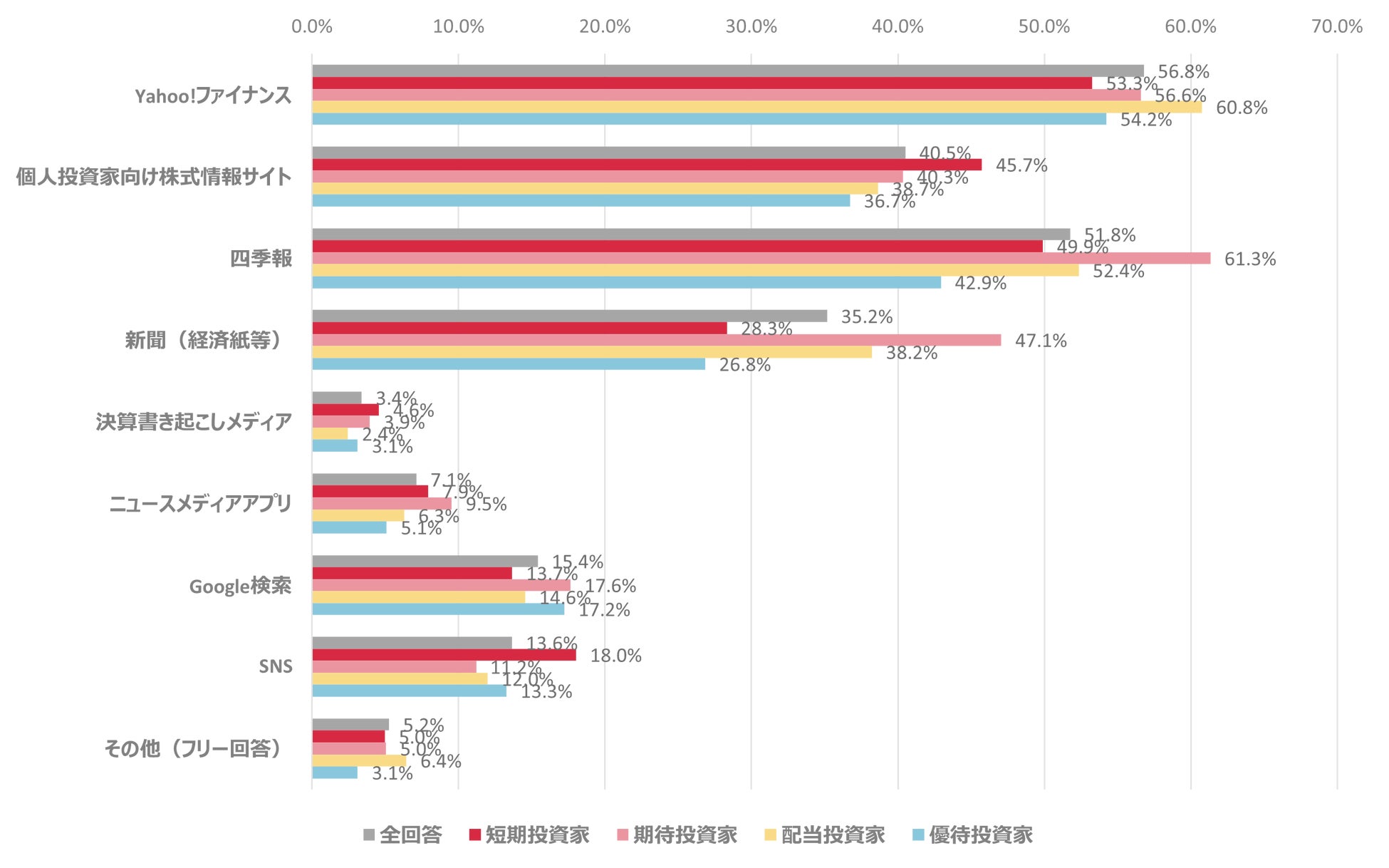 配当投資家はYahoo!ファイナンスや四季報の比重が高く、期待投資家はYahoo!ファイナンス、四季報に加えて新聞の比重が高い結果となった。