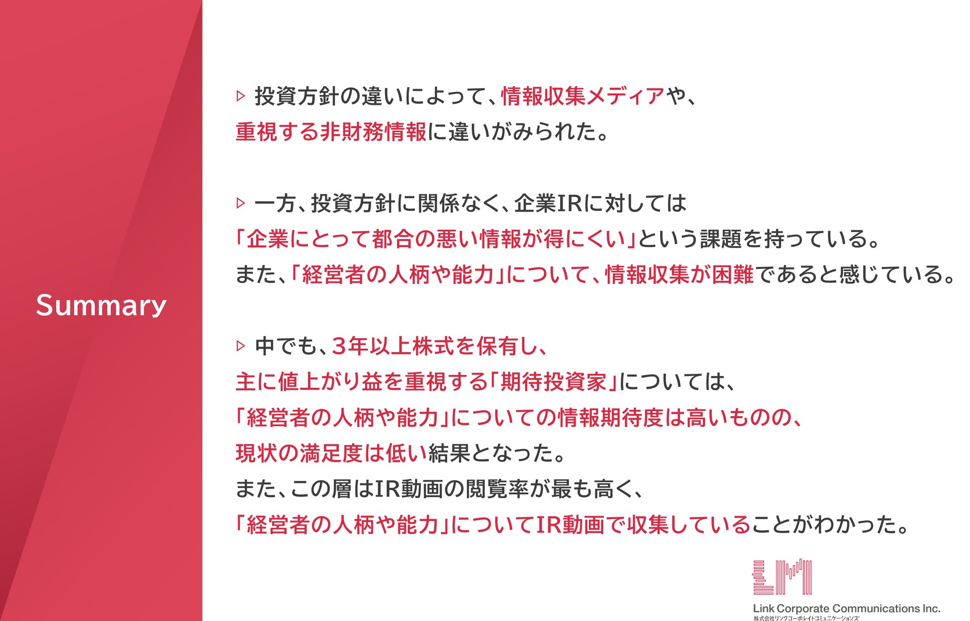 「経営者の人柄や能力」については、特に期待投資家において情報重視度が高いにも関わらず、現状の情報満足度が低い結果となった。