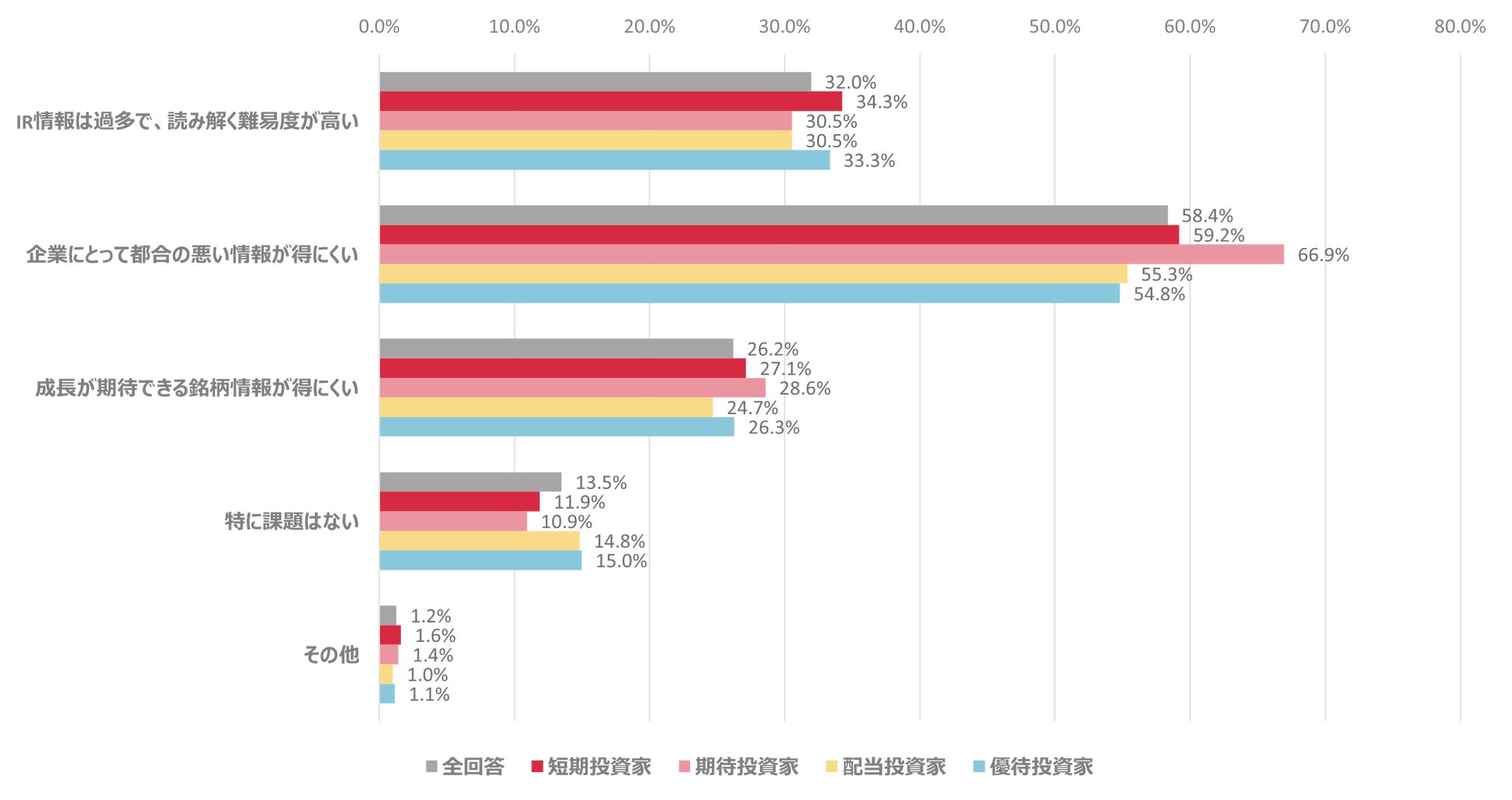 全体的な傾向として、「企業にとって都合の悪い情報が得にくい」が58.4%と最も高くなり、良いことだけでなく、都合の悪いことについても開示する、フラットな情報開示を望んでいることがわかった。また、特に期待投資家においてこの傾向がみられた。