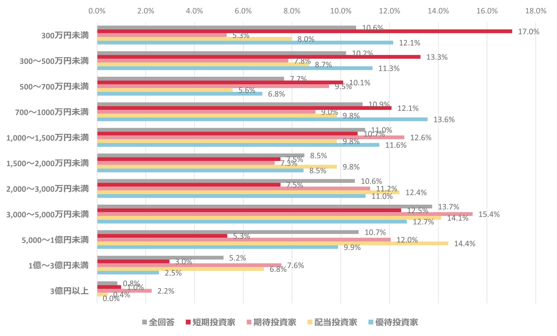 ・投資資金:300万円未満 10.6% 300~500万円未満 10.9% 500~700万円未満 8.7% 700~1000万円未満11.0% 1,000~1,500万円未満 11.1% 1,500~2,000万円未満 8.6% 2,000~3,000万円未満 10.5% 3,000~5,000万円未満 12.8% 5,000~1億円未満 10.1% 1億~3億円未満 4.9% 3億円以上 0.8%