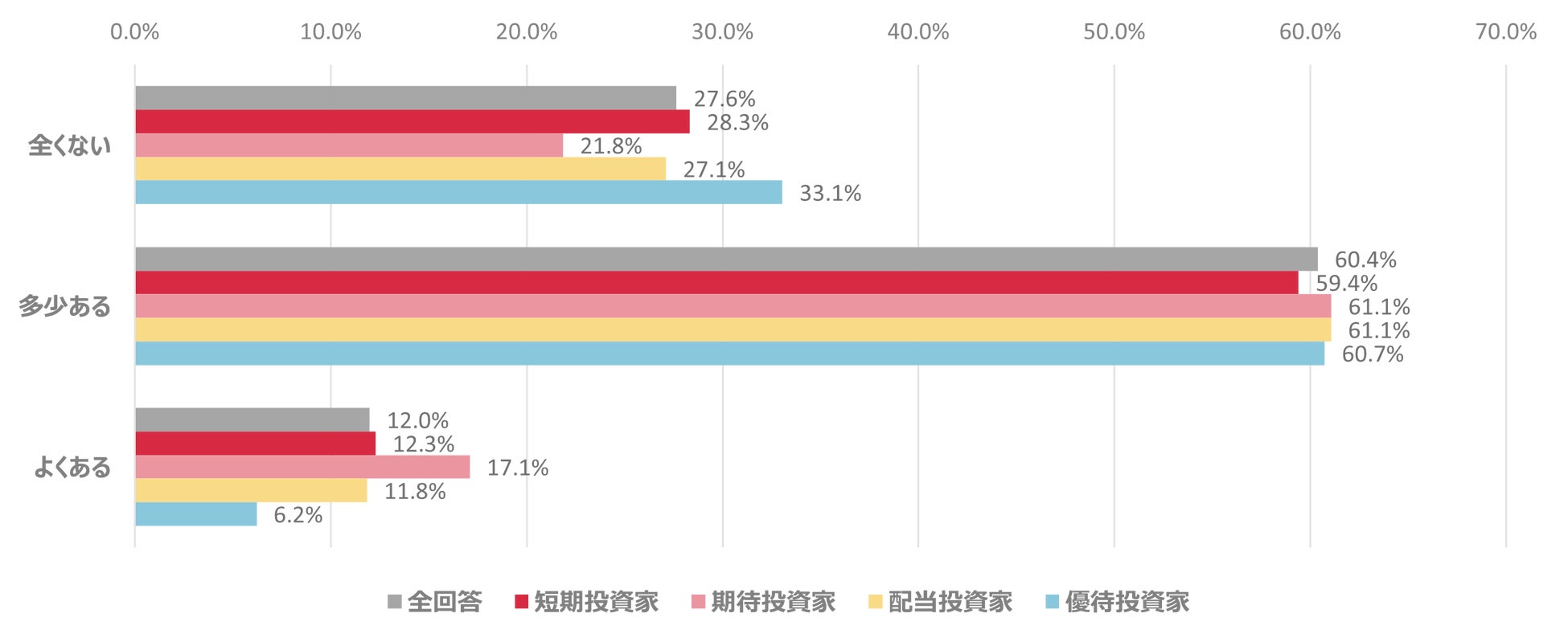 全体的な傾向としては約72%が「多少ある・よくある」と回答しており、IR説明会などの動画においても投資関連の情報収集をしていることがわかった。