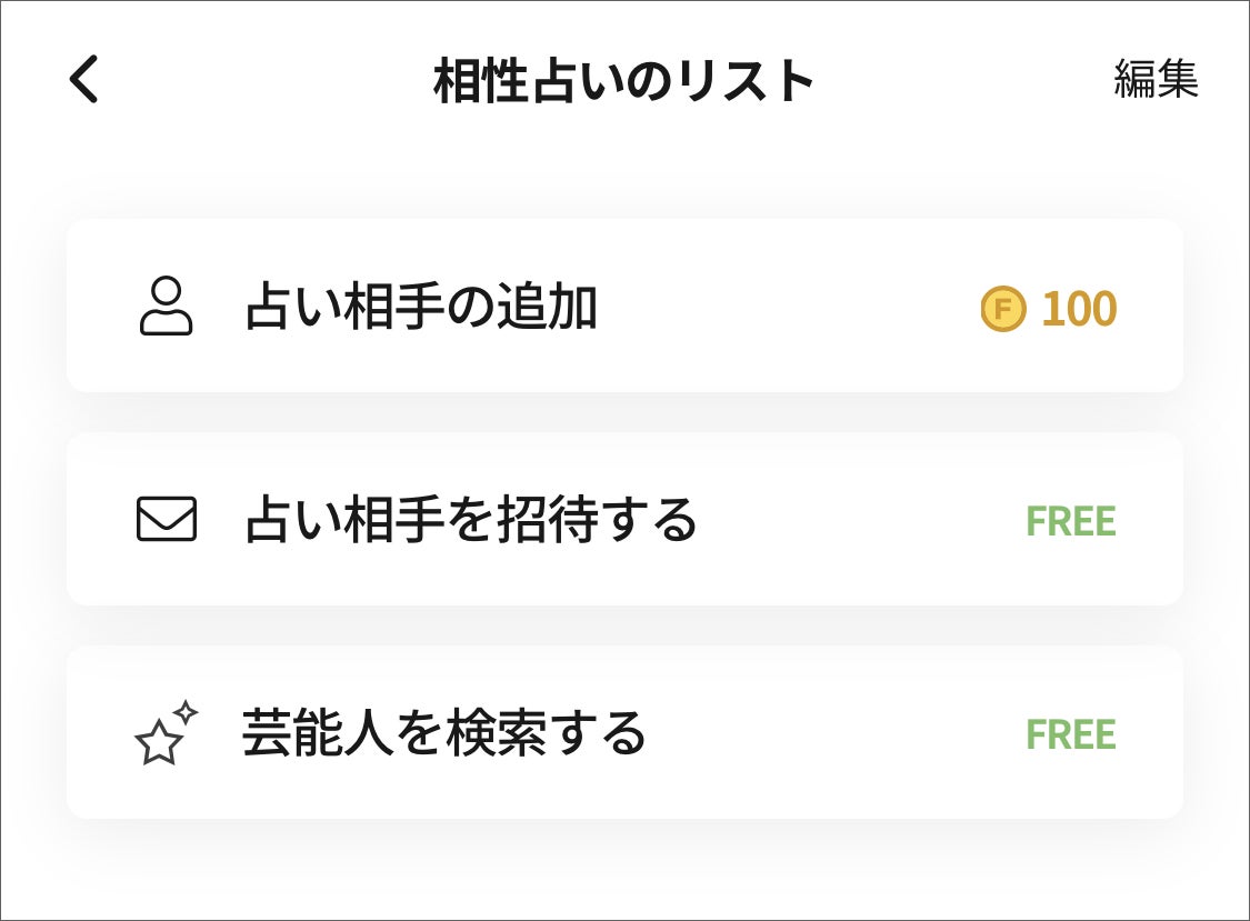 本機能を利用して占い相手を招待した場合、アプリ内にある全ての相性占いにおいて、招待した相手との相性占いを全て無料でお楽しみいただけます。