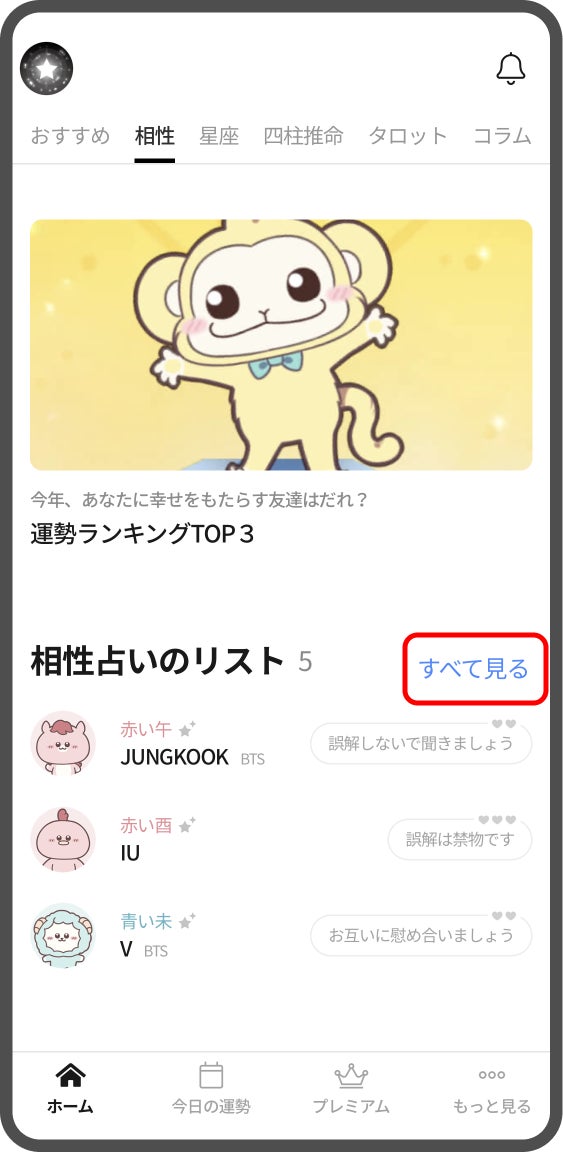 - ② 下にスクロールして「相性占いのリスト」の「すべて見る」タップ