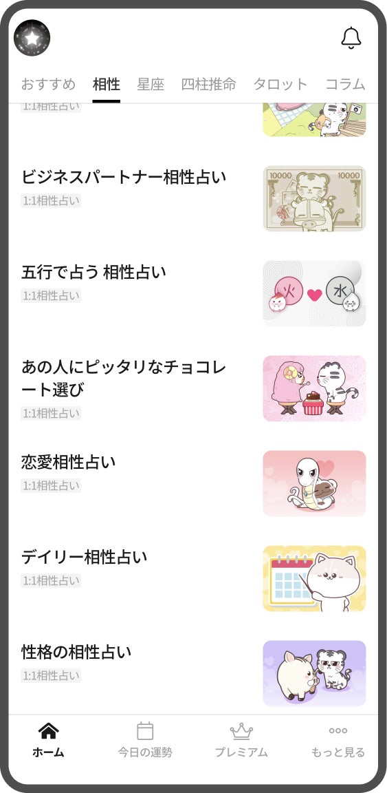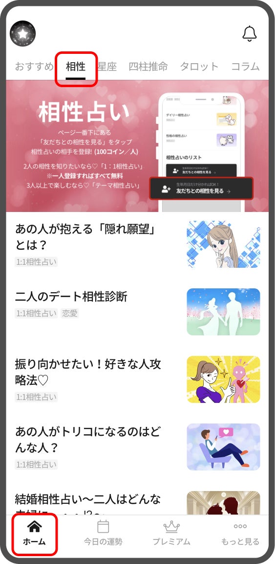 - ① アプリ内「ホーム」タブ > 上段「相性」をタップ