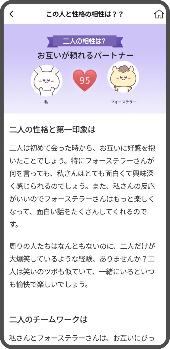 - ⑤ 招待された相手が新規ログインしたら、相性占いの結果を見ることができます