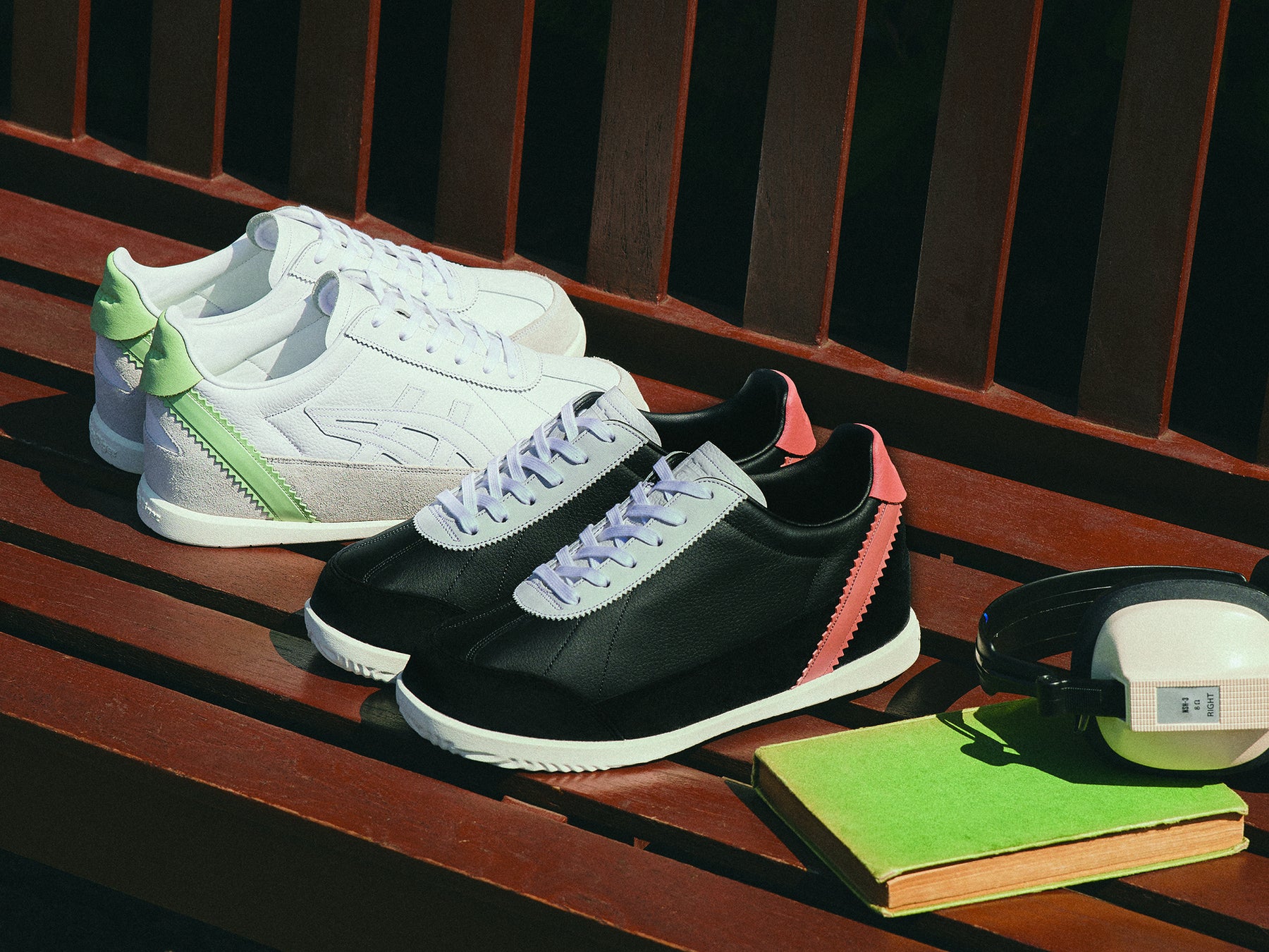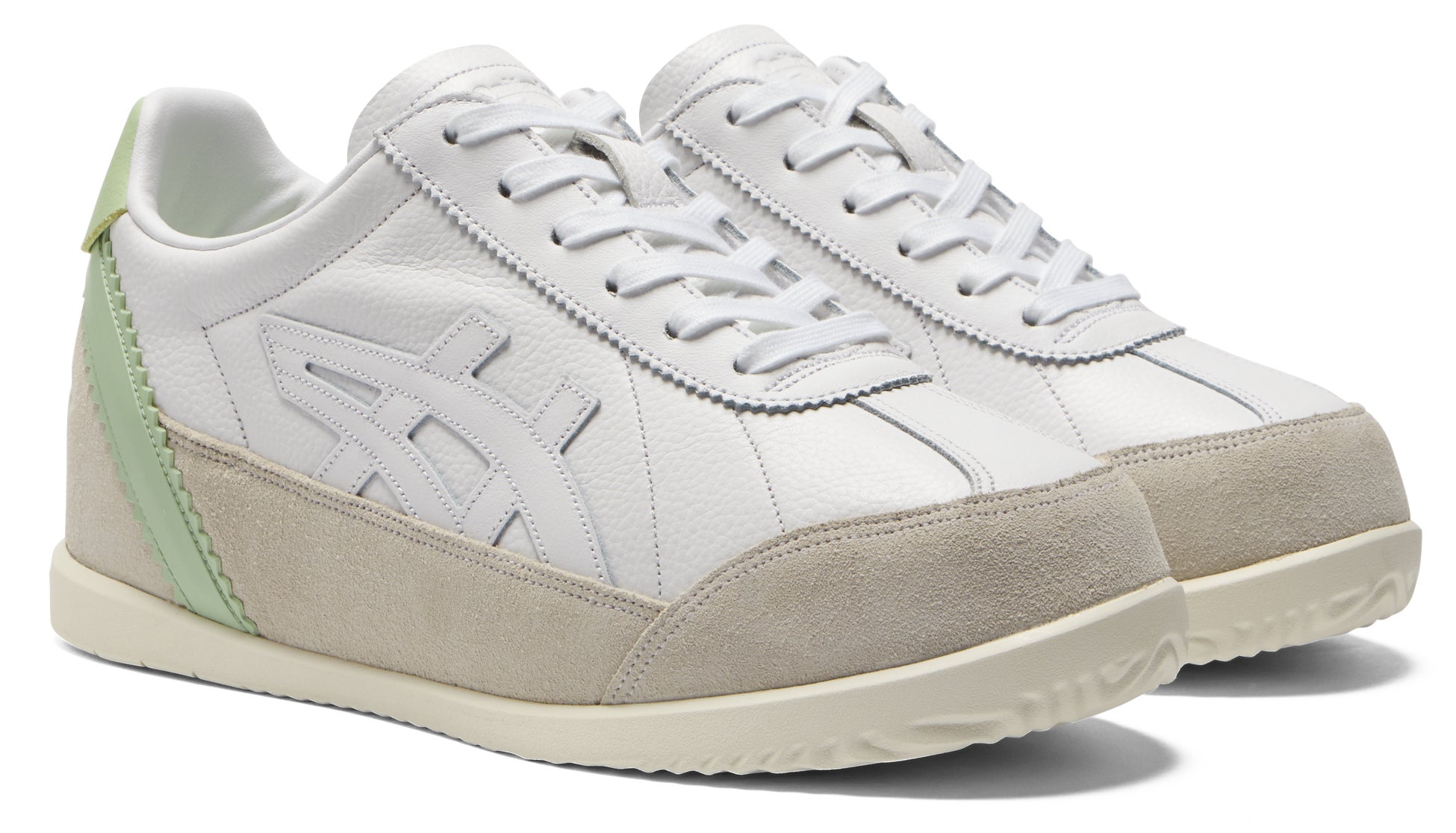 オニツカタイガーストライプを施しスポーティーに仕上げたホワイトと、クリーンでミニマルなデザインのグレーの2色展開です。かかと部に配置されたグリーンとサーモンピンクの樹脂製補強パーツのデザインはブランドアイコンモデル「MEXICO 66™」のエッセンスを取り入れ、印象的なバックスタイルに仕上げています。スタイリングの幅を広げるブラックのスペアシューレースも付属しています。