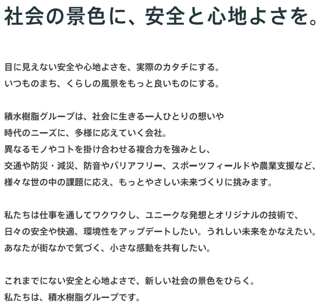 「社会の景色」は、道路やまち、身の回りの景色、物流や農業なども想起させる、積水樹脂グループが事業ドメインとする様々な「景色」と「広がり」を表しています。そこに「安全」と「心地よさ」という積水樹脂グループの提供価値をわかりやすくメッセージ。なお「心地よさ」という言葉は、人や街、地球環境などへの心地よさ(=環境性)という意味も内包しています。