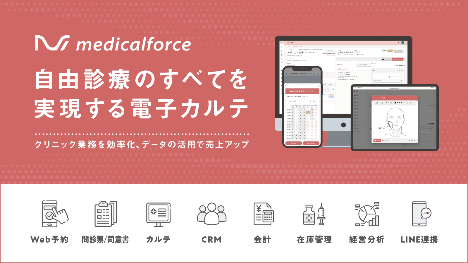 「medicalforce」は美容クリニック・自由診療の現場業務を1つのシステムで管理・連携を可能にするオールインワンSaaSです。診療の予約や問診、電子カルテなどの日常業務に加えて顧客情報管理(CRM)の機能も備え、対話アプリケーション「LINE」との連携など、患者様の利便性を高める機能も追加が可能です。